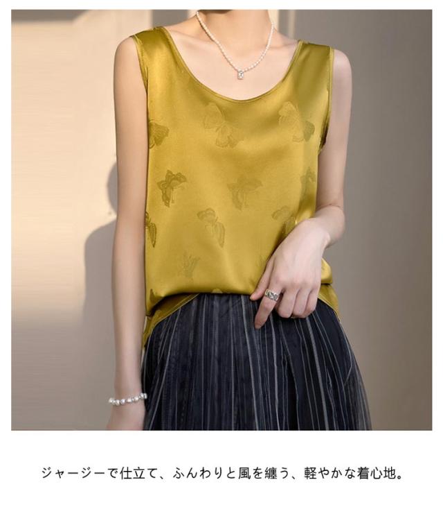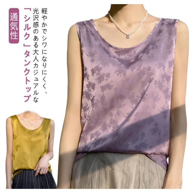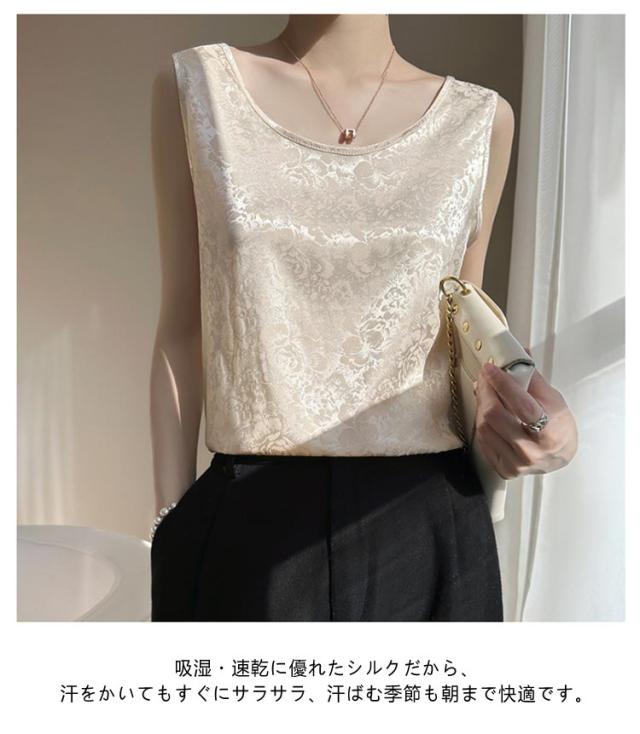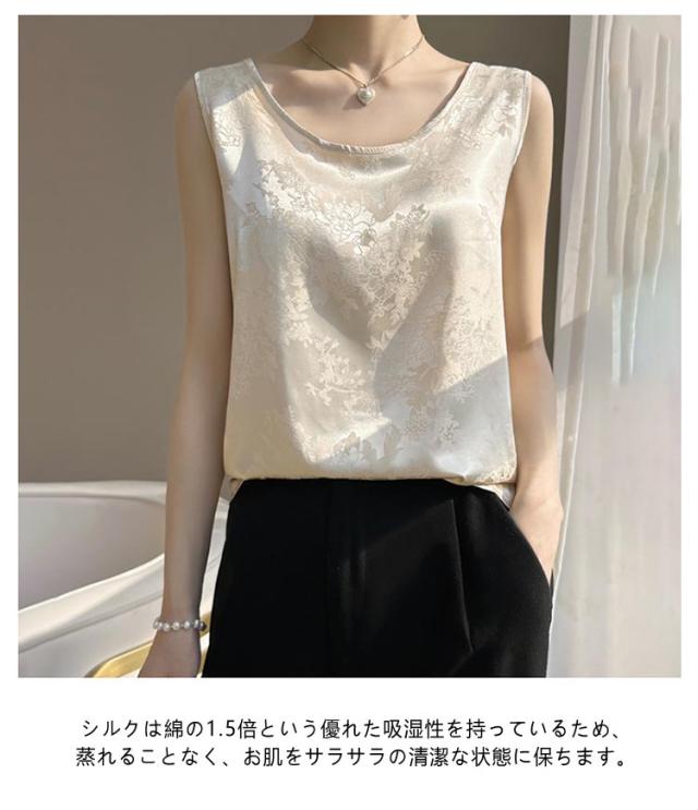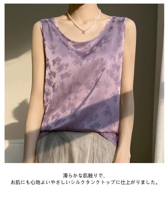 | 軽やかでシワになりにくく、光沢感のある大人カジュアルな「シルク」タンクトップ ▼美しい落ち感のある生地で、しっとり健やか&天然シルク★ ▼滑らかな肌触りで、お肌にも心地よいやさしいシルクタンクトップに仕上がりました。 ◎しっかり柔らかな光沢感のあるとろみ素材キレイめな生地感。 ◎ジャージーで仕立て、ふんわりと風を纏う、軽やかな着心地。 ◎素肌をより引き立ててくれて高貴でエレガントな大人女性に。 ◎重みを感じることがなく、ふわっとした軽さで肩こりの心配もありません。 シルクは綿の1.5倍という優れた吸湿性を持っているため、 ♪蒸れることなく、お肌をサラサラの清潔な状態に保ちます。 ♪身につけることで素肌の乾燥を防ぎ、しっとりスベスベの肌へと導きます ♪吸湿・速乾に優れたシルクだから、汗をかいてもすぐにサラサラ、汗ばむ季節も朝まで快適です。 | |