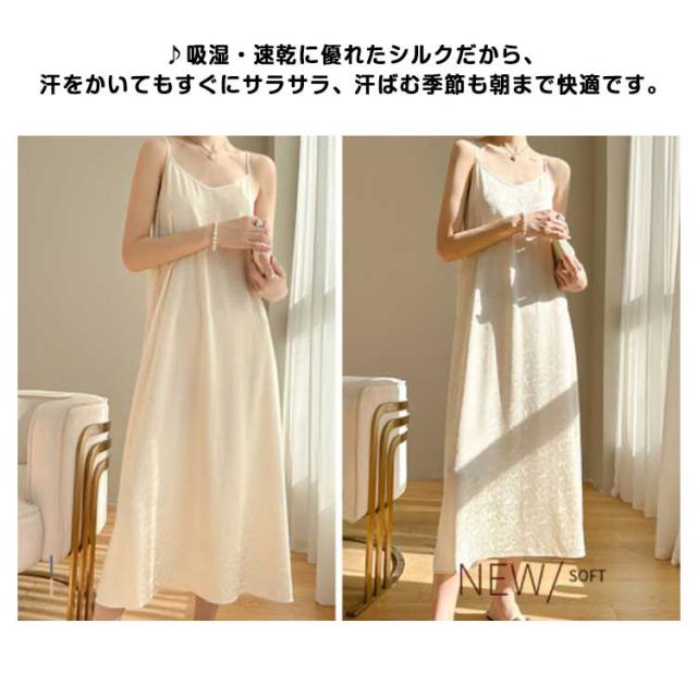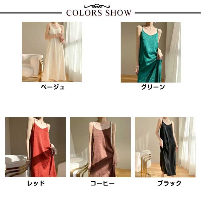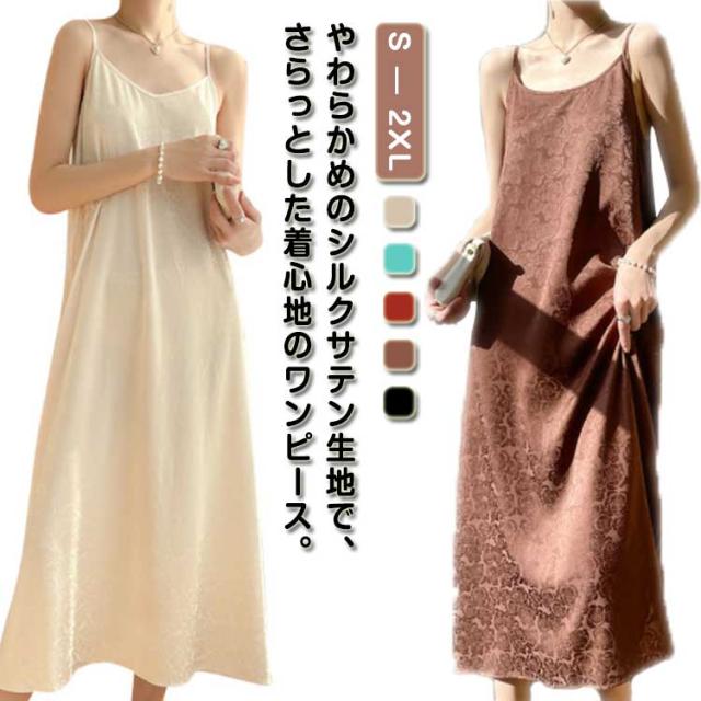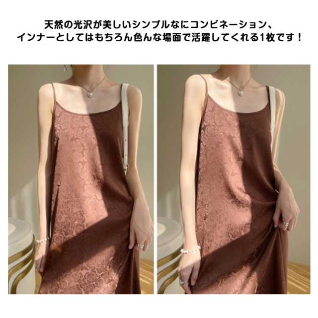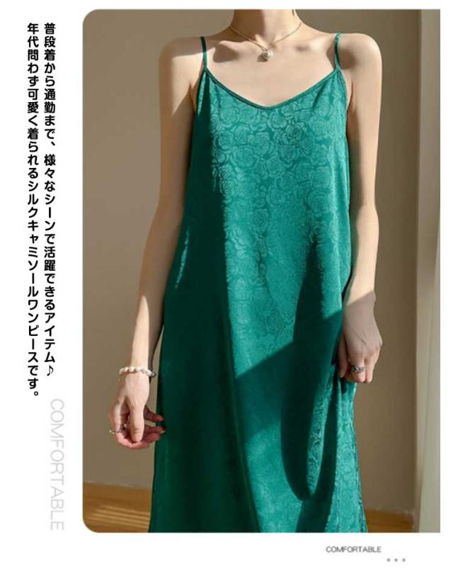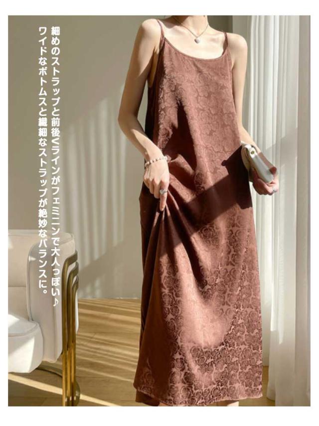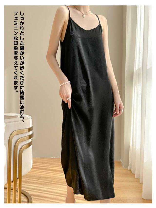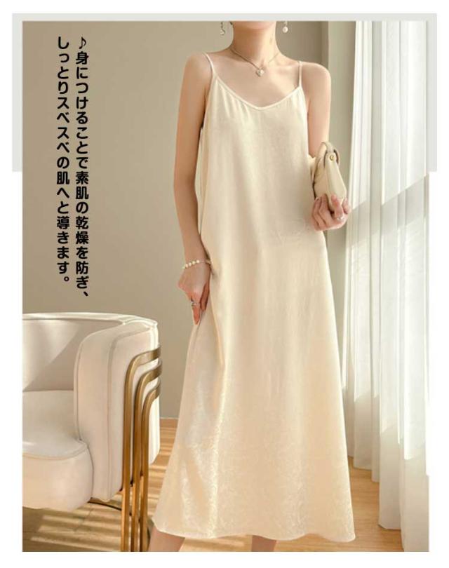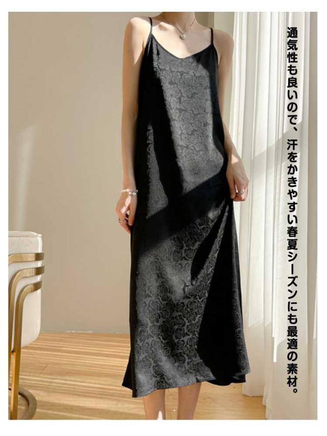 ジャカード キャミソール ワンピース シルク サテン レディース 夏 Vネック ひざ下丈 ロング丈 ワンピース ノースリーブ 細 ストラップ 大きいサイズ ゆったり オールインワン サロペット インナー ノースリーブワンピ キャミソールワンピ
