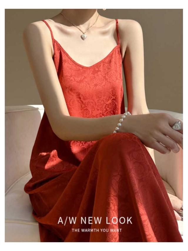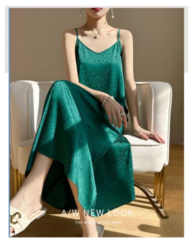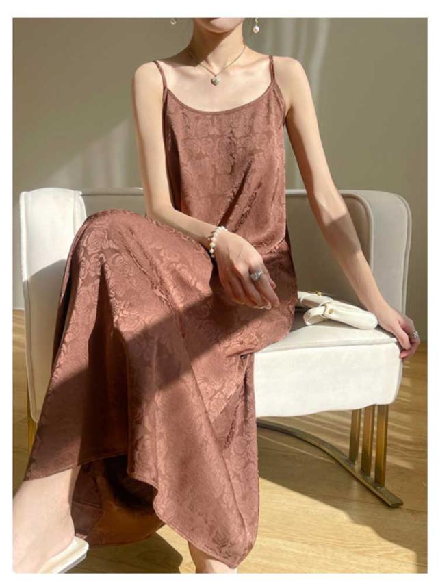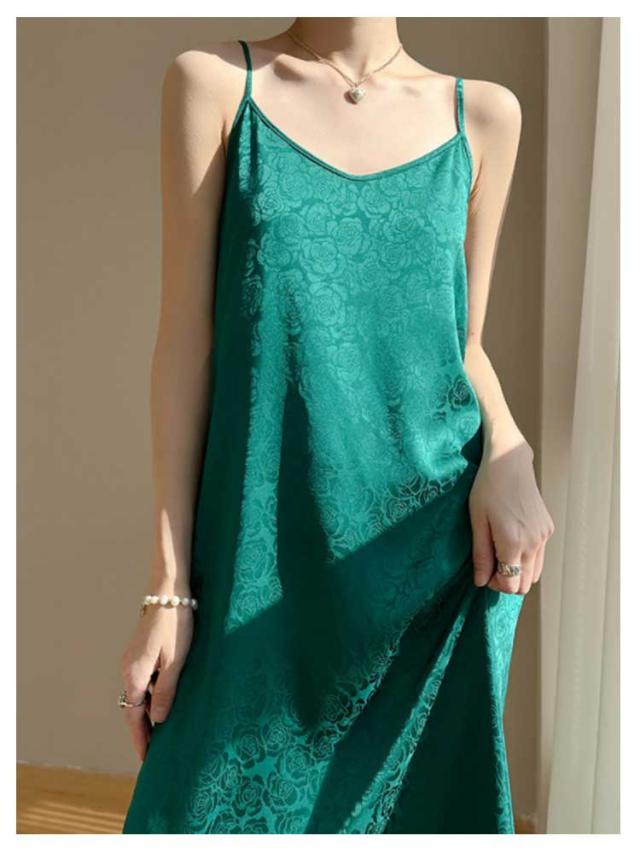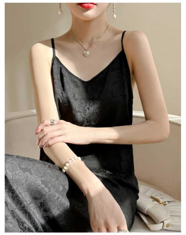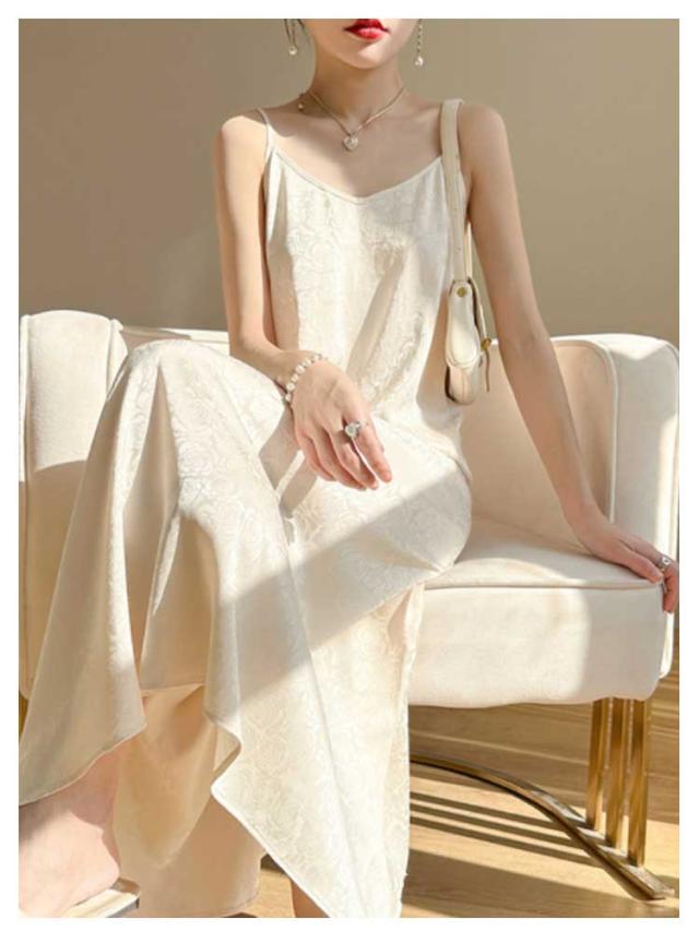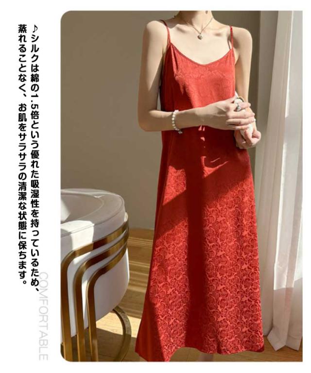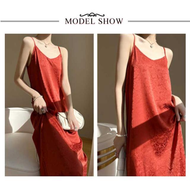 ジャカード キャミソール ワンピース シルク サテン レディース 夏 Vネック ひざ下丈 ロング丈 ワンピース ノースリーブ 細 ストラップ 大きいサイズ ゆったり オールインワン サロペット インナー ノースリーブワンピ キャミソールワンピ