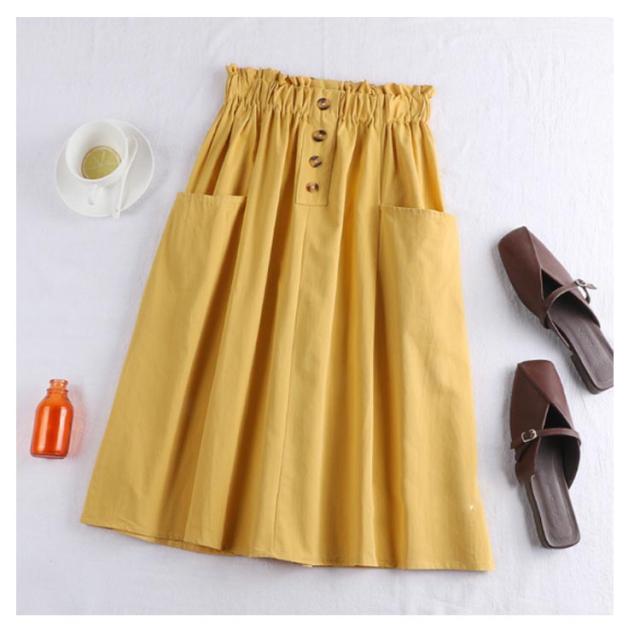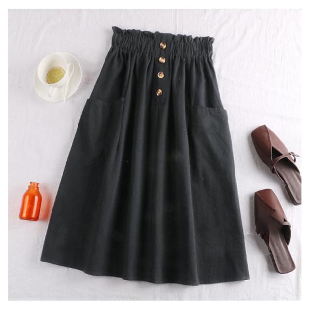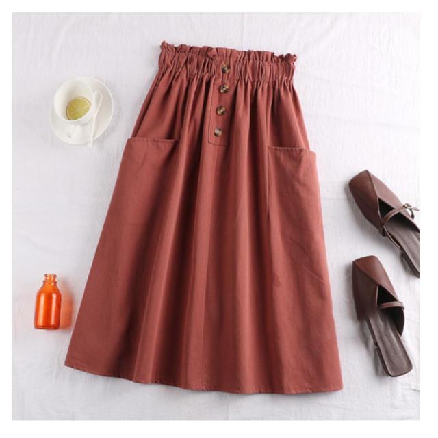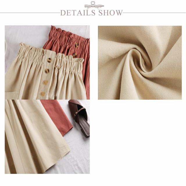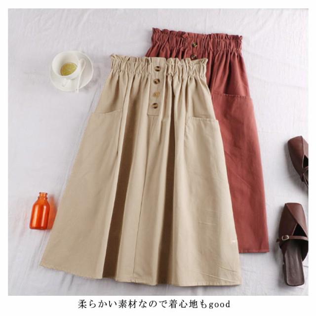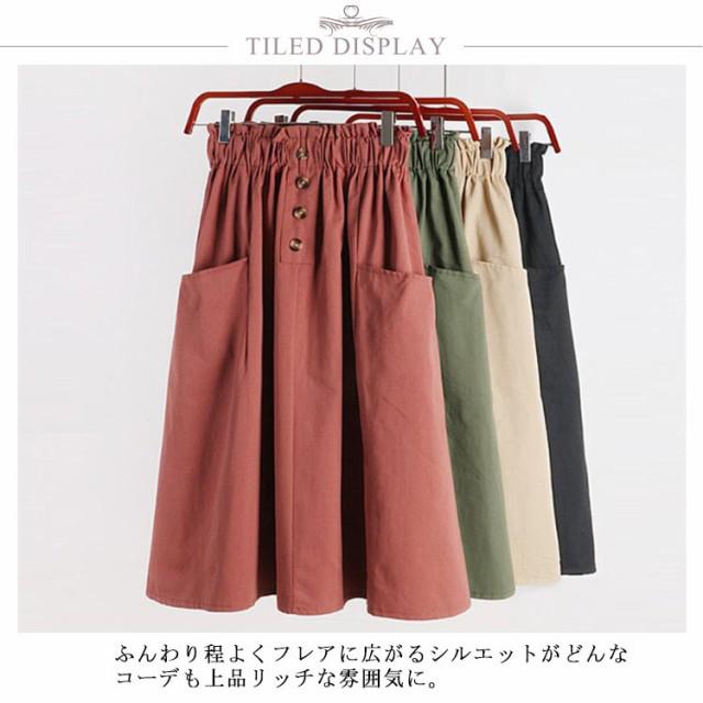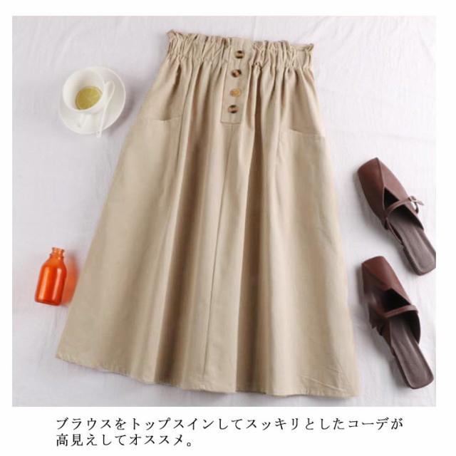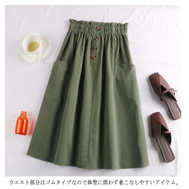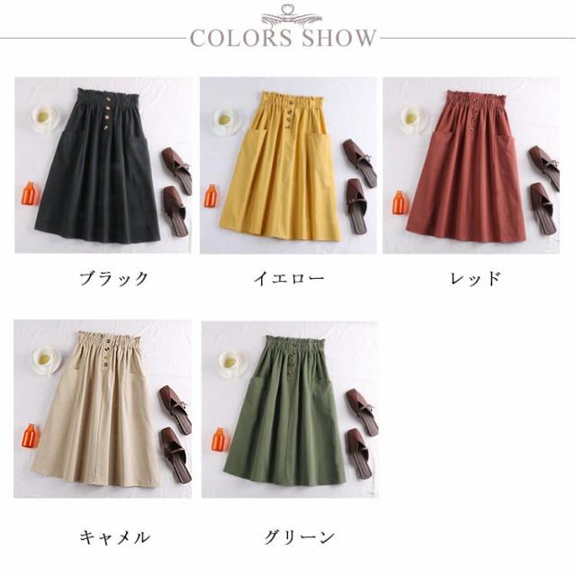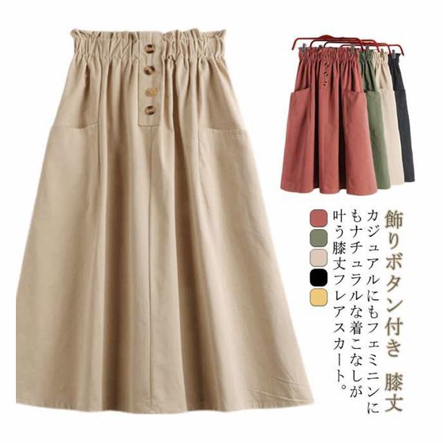 レディース フレアスカート ボタン付き ハイウエスト ウエストゴム ポケット付き 飾りボタン付き 膝丈 春夏 夏スカート 無地 レディース ゴムウエスト カジュアル フロントボタン 送料無料
