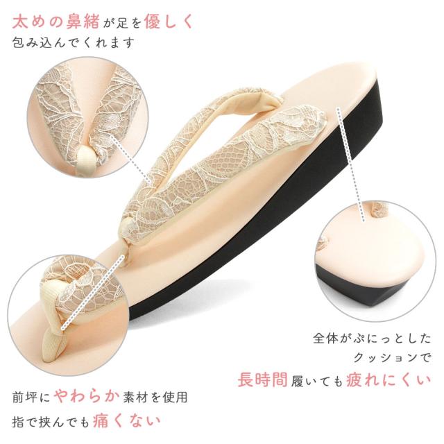 鼻緒に繊細なレースを使用した上品で華やかなデザインは、履くだけで気分が上がるお洒落アイテム。