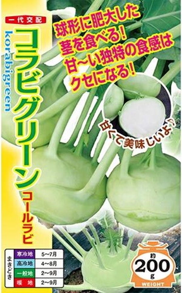 ●キャベツの一種で丸く肥大した茎を食べる。耐暑・耐寒性は強く栽培は容易。 ●生育スピードが早く、揃いの良い早生種。 ●外観は淡緑色で肉色はクリーム色。肉質はやわらかく、ス入り遅い。 ●収穫遅れは過熟になり硬くなるので、適期収穫を心がける。 ●6cm〜8cm位がオススメの食べ頃、10cm以上になると硬くなってくるので早めに収穫する。 |