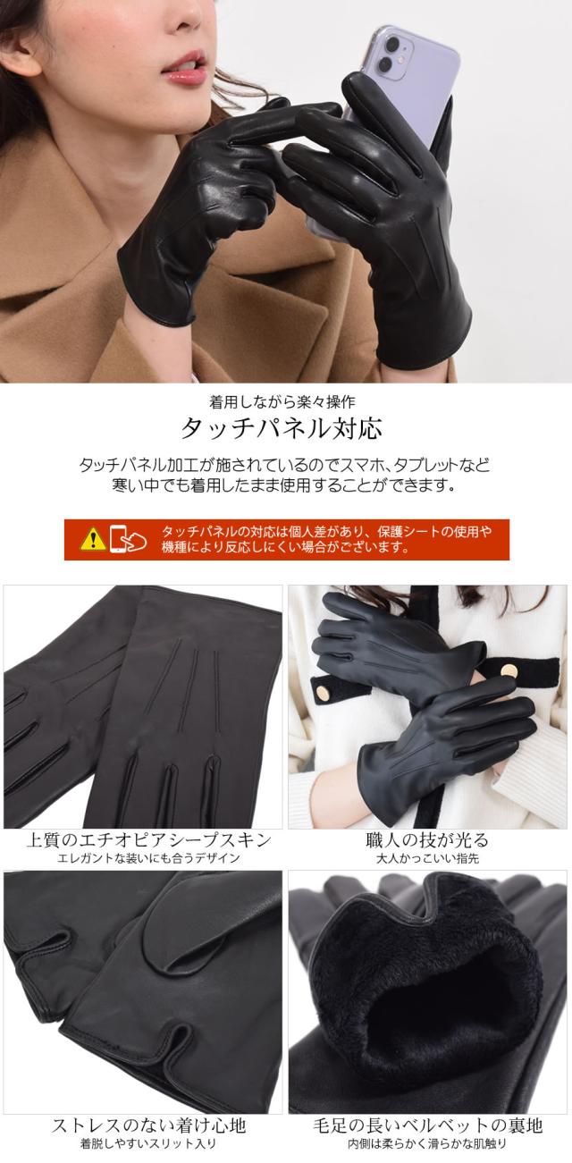 上品な光沢と質感、手のひらに吸い付くような柔らかく滑らかな感触の「エチオピアシープ」を使用した手袋。一般的なレザーよりも非常に高い伸縮性を持ち、使い込むうちに手に馴染みフィット感が増していきます。スッキリとしたフォルムの立体裁断で手に馴染むように職人がこだわった丁寧な仕上がり。内側は毛足の長いベルベット裏地で柔らかく滑らかな肌触り。タッチパネル加工が施されているのでスマホ、タブレットなど寒い中でも着用したまま使用することができます。波型のステッチが表情を醸しだし、スッキリとしたシルエットで華奢見せに。