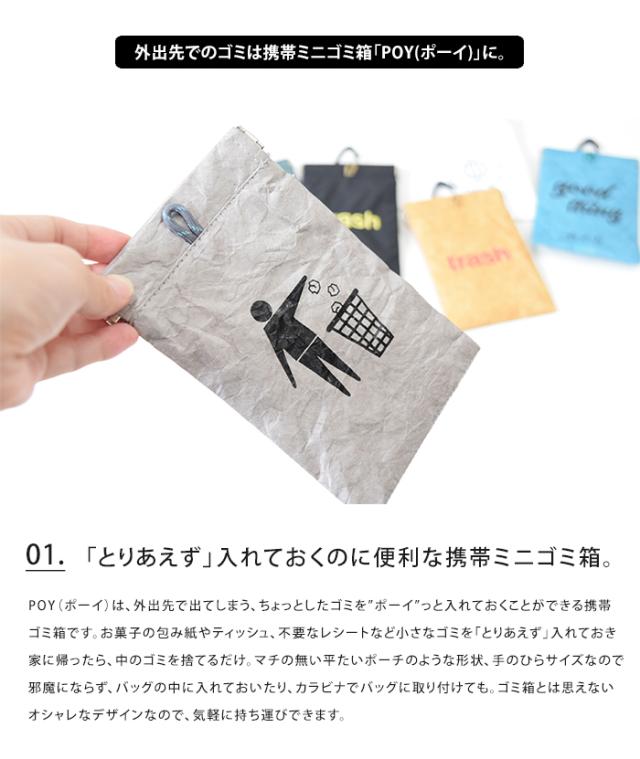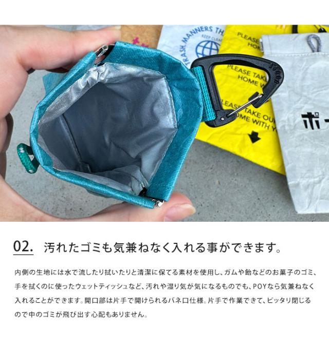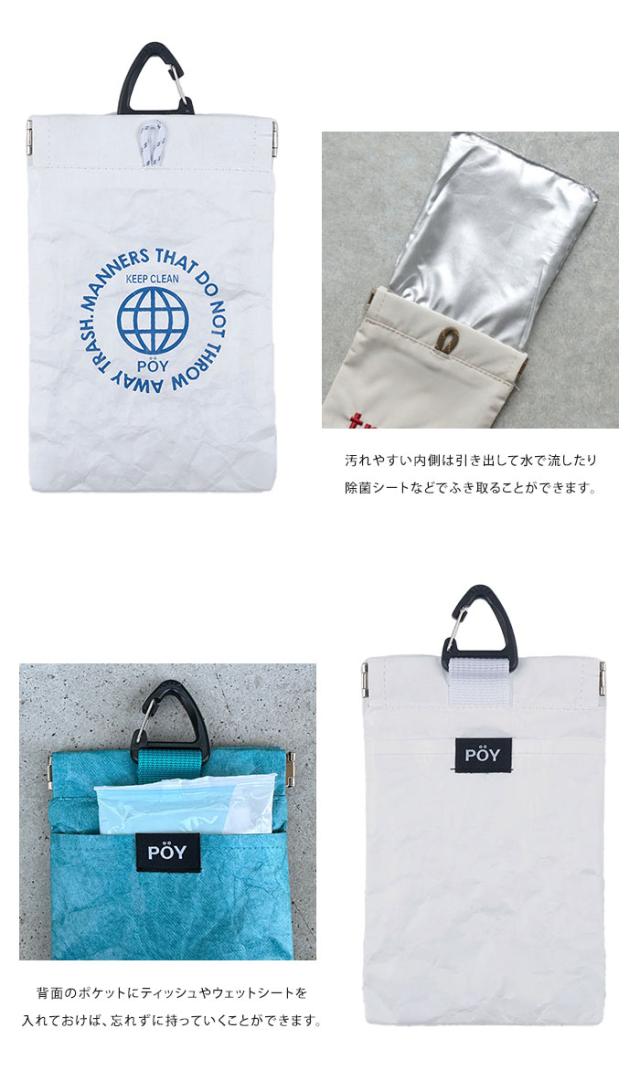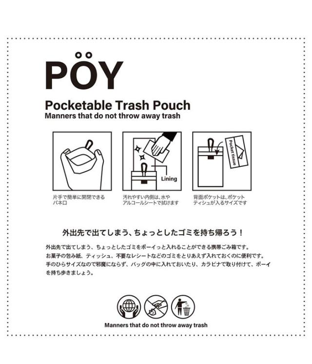 POY(ポーイ)は、外出先で出てしまう、ちょっとしたゴミを”ポーイ”っと入れておくことができる携帯ゴミ箱です。お菓子の包み紙やティッシュ、不要なレシートなど小さなゴミを「とりあえず」入れておき、家に帰ったら中のゴミを捨てるだけ。マチの無い平たいポーチのような形状、手のひらサイズなので邪魔にならず、バッグの中に入れておいたり、カラビナでバッグに取り付けても。ゴミ箱とは思えないオシャレなデザインなので、気軽に持ち運びできます。