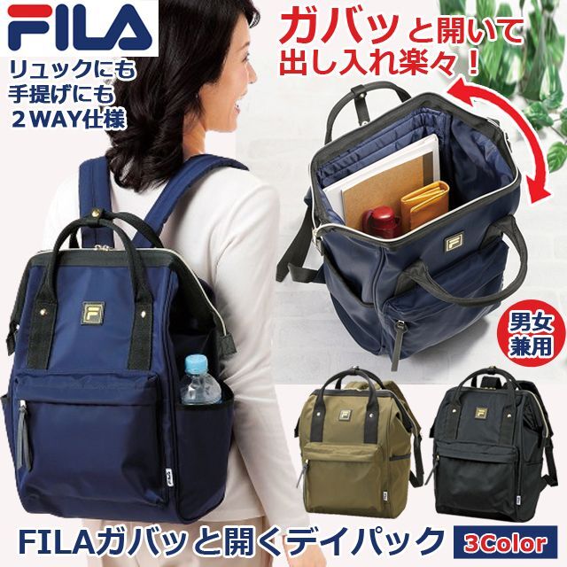 敬老の日 プレゼント レディース メンズ バックパック リュック(FILA ガバッと開く デイパック)フィラ 手提げ かばん カバン 2WAY 男女兼用 サイドポケット A4 大容量 ナイロン