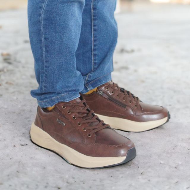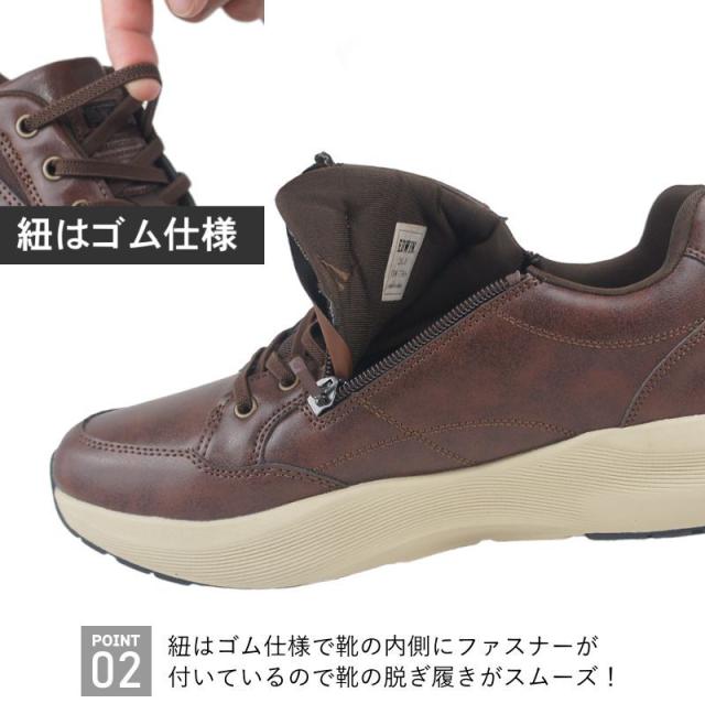 ・伸縮ゴムタイプのシューレースで、足の甲幅に合わせて調整自在。履き口外側のサイドゴアと内側のファスナーで脱ぎ履きもスムーズ。