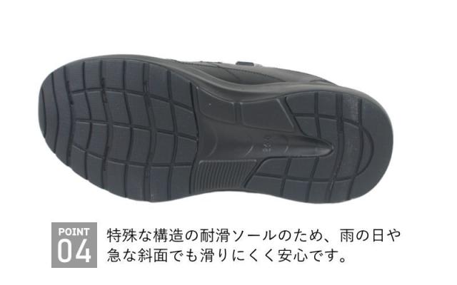 ・ブロック状の凹凸が刻まれたアウトソールで、雨に濡れた路面やツルツルと滑りやすいフロアーでもしっかりとグリップ。