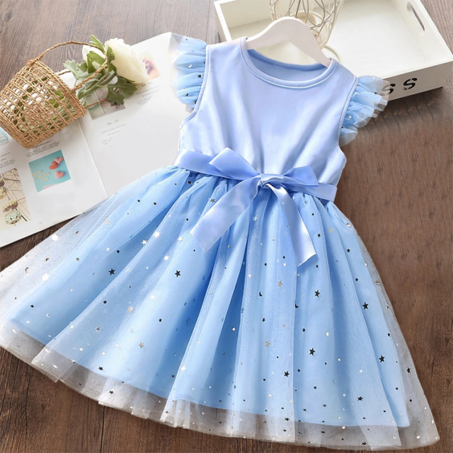 女の子の ノースリーブの蝶と星の模様のシフォンのスカート オーガンジー重ね バタフライドレス ワンピース パーティー プリンセスファッション 夏 秋 半袖 ノースリーブ