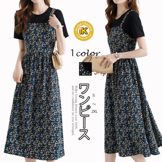 ロングワンピ 切り替え フェイクワンピ 半袖 夏 Aライン 花柄 ひざ下 マキシ丈 20代 30代レディースファッション ワンピース