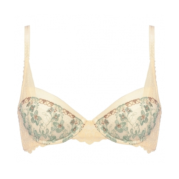デイジー柄のエンブロイダリーレースをハーフカップ風に施し、カップ上辺はチュールに切り替え、軽やかに仕上げた華奢見えデザイン。