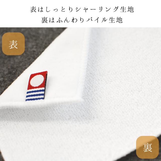 表面はしっとりとした肌触りとツヤ感あるシャーリング生地、裏はパイルが立ち上がったふんわりと弾力を感じる風合いで柔らかく、吸水性抜群のパイル生地で仕上げられています。