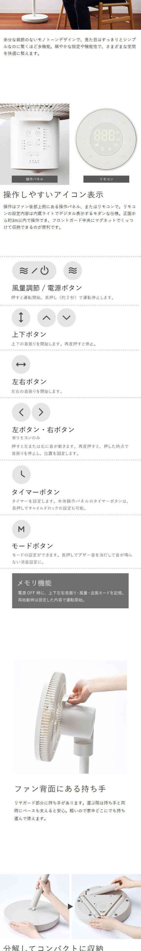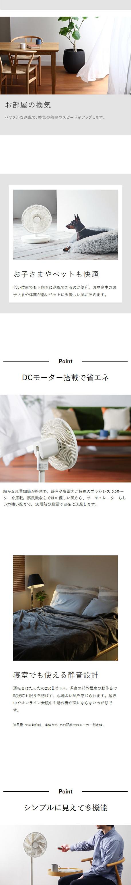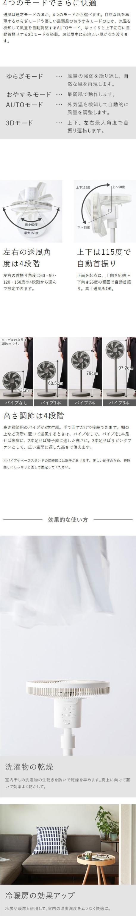 ほぼ360度全方向の送風ができる、コードレス充電式のリビングファン。DCモーター採用で静音かつ細かな風量調節が可能。高さは4段階で調節OK。部屋干しや冷暖房の効率UPにも活躍します