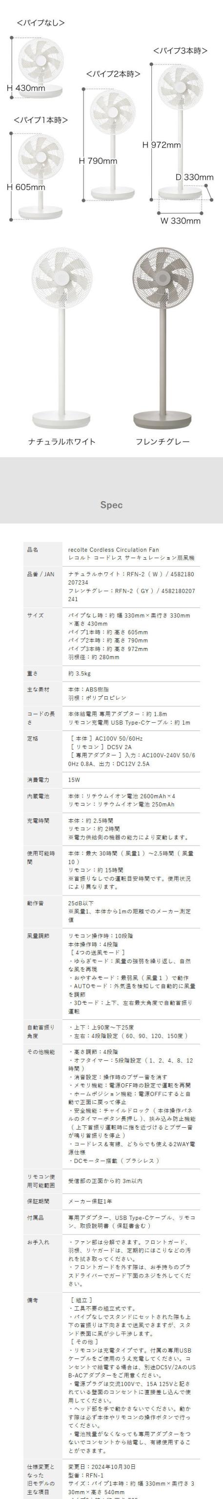 [ recolte コードレス サーキュレーション扇風機 ]レコルト コードレス 扇風機 サーキュレーター 首振り 充電式 DCモーター 静音 リモコン タイマー 風量調節 省エネ 節電 自動首振り 約 360度 360° 充電 dc リビング 空気循環 白 ホワイト グレー RFN-2
