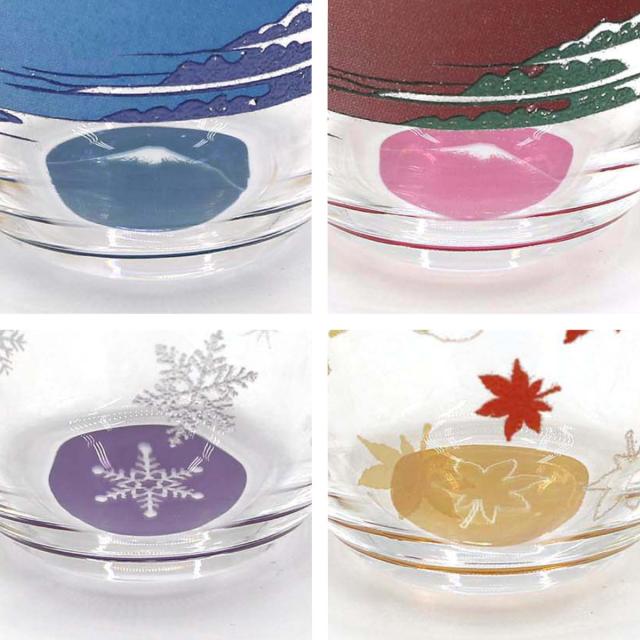 グラスの底面に色を付ける技法です。反射効果で全体に淡く色が映ります。それぞれのモチーフが描かれており飲み物を注ぐ際や飲み終わる度に楽しくなります。