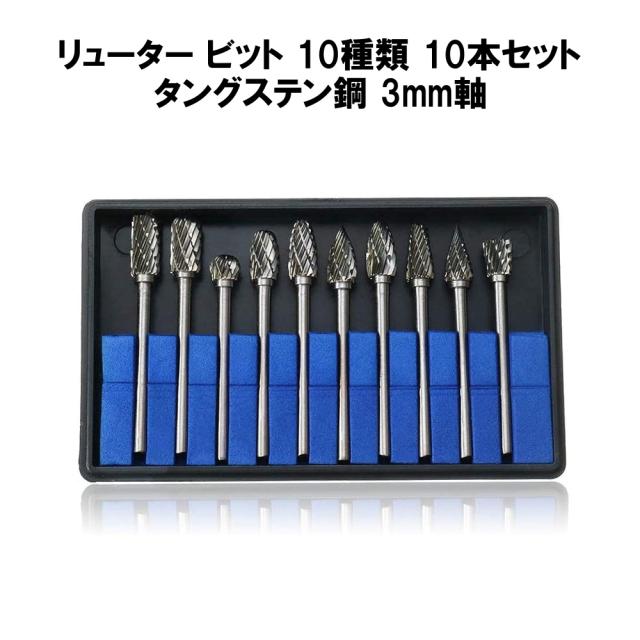リュータービットセット 10本セット 3mm 軸 刃幅 6mm 50mm長 超硬 カッター ビット タングステン リューター ルーター 先端工具 アルミ 切削
