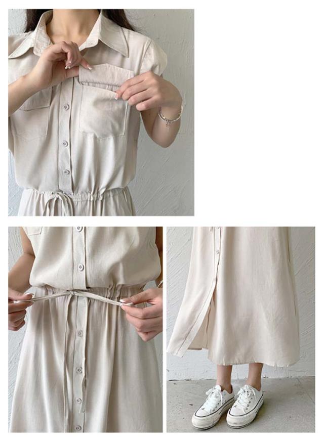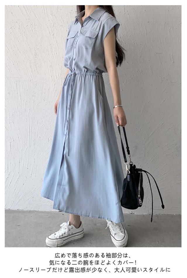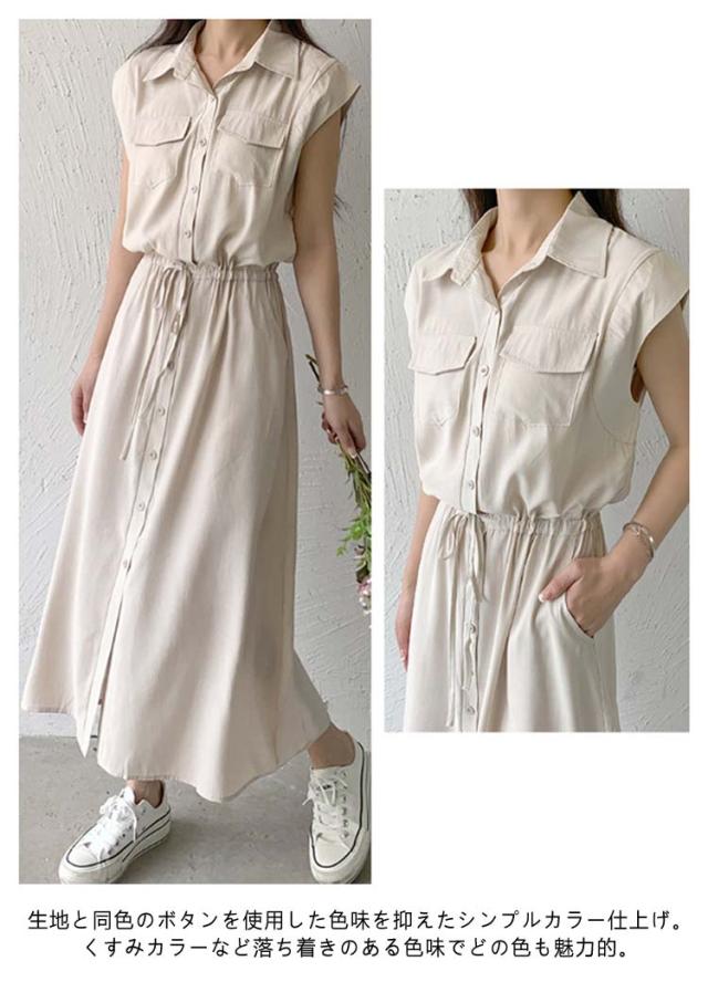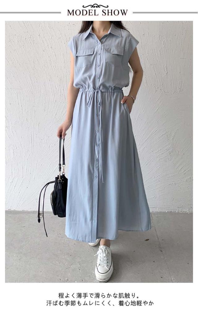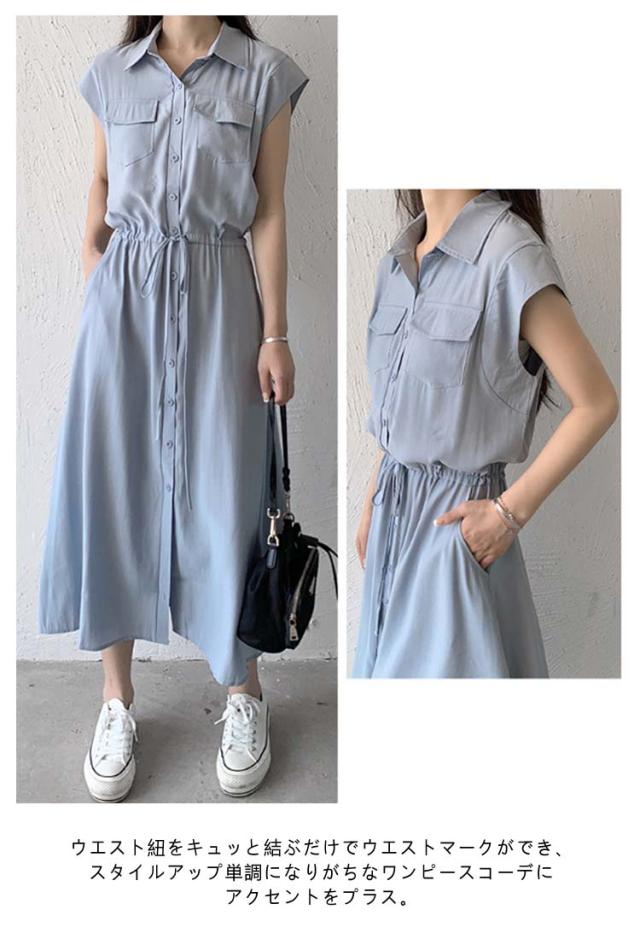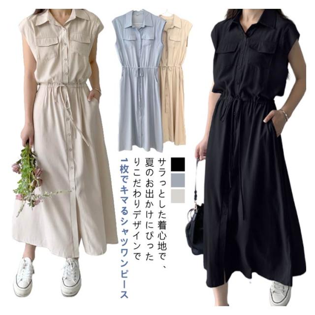 夏 ウエスト絞り 前開き シャツワンピース レディース ロングワンピース 送料無料 マキシワンピース シンプル オフィス フレンチスリーブ Aライン レギュラーカラー おしゃれ OL カジュアル ノースリーブ