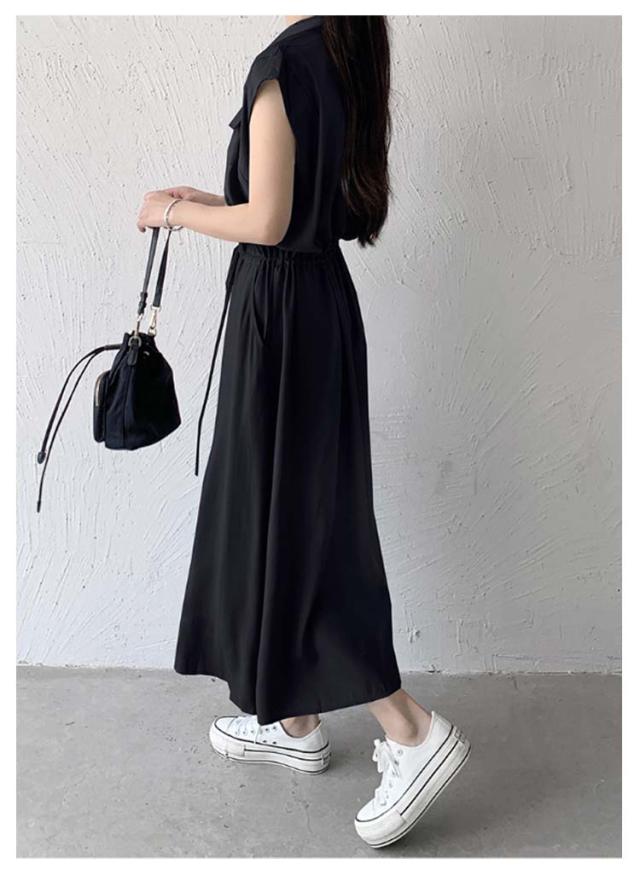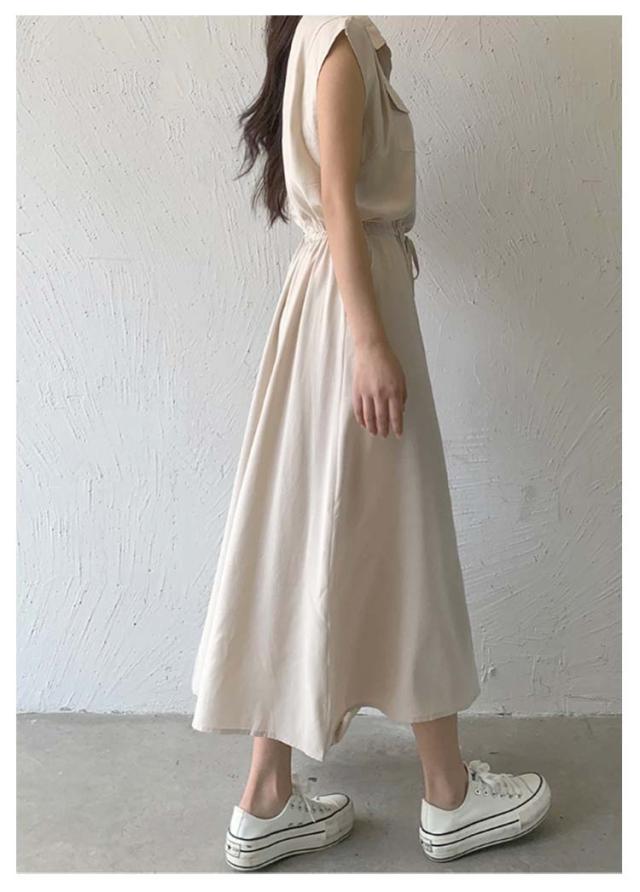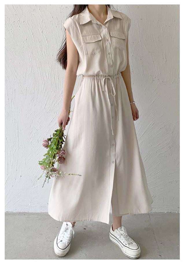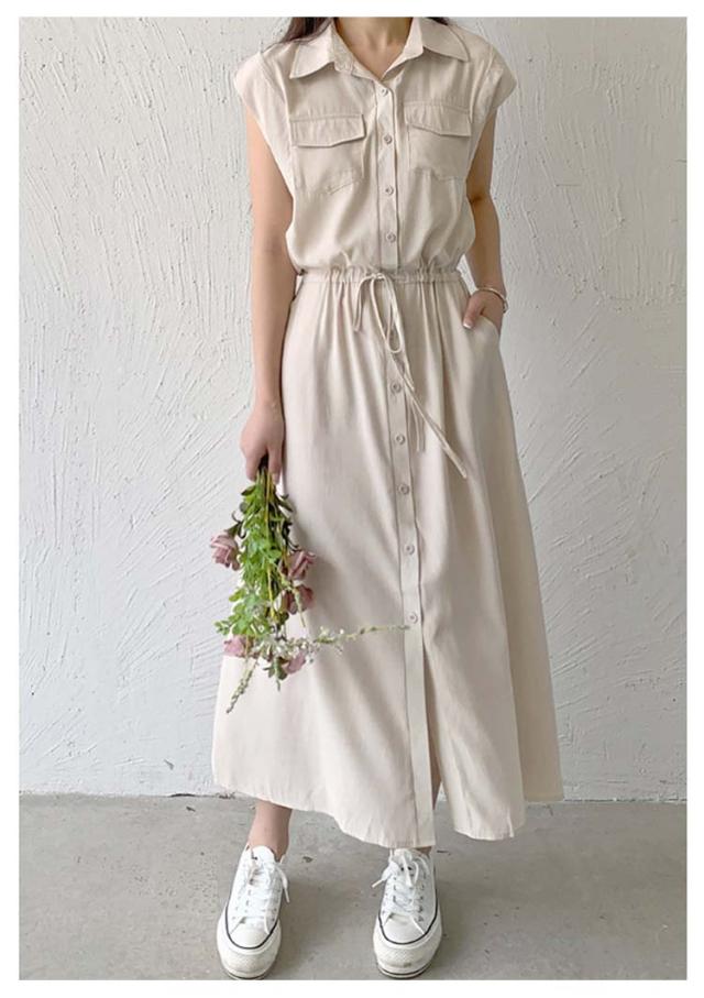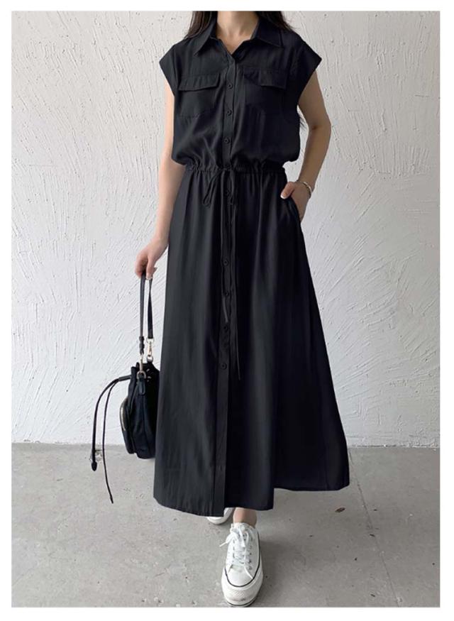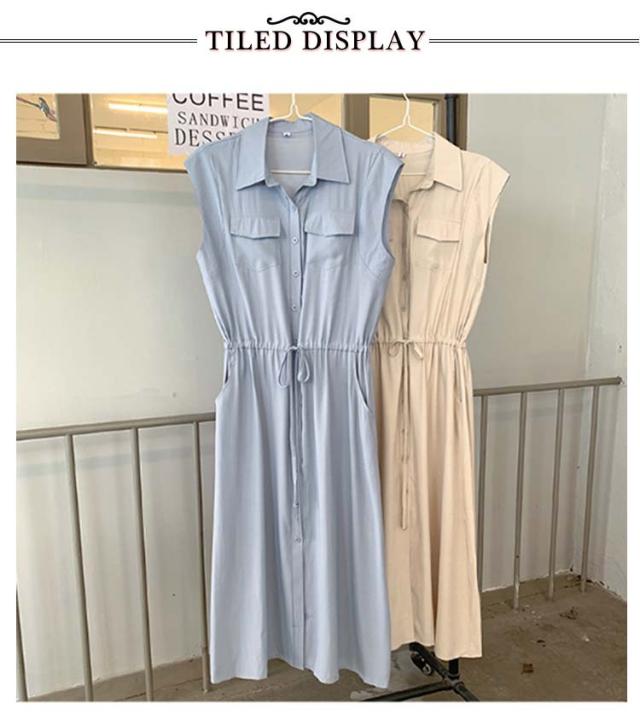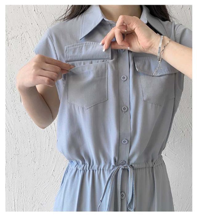 夏 ウエスト絞り 前開き シャツワンピース レディース ロングワンピース 送料無料 マキシワンピース シンプル オフィス フレンチスリーブ Aライン レギュラーカラー おしゃれ OL カジュアル ノースリーブ
