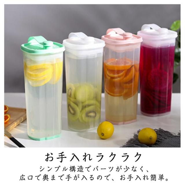 | スタイリッシュ&美カラーのピッチャー 冷蔵庫内にコンパクトに収まるスタイリッシュなピッチャー。 肉厚でしっかりしたボディはガラスのような透明感。 中身がすっきり美しく見えます。 横倒しにして冷蔵庫の棚にも収納できます。冷蔵庫のスペースを有効活用!底面が角型なので横に寝かせた時も安定感があります。 冷蔵庫のドアポケットOK 冷蔵庫のドアポケット前列にぴったり収まります。 漏れにくく開け締めしやすい 手がかけやすく開閉しやすいD型形状のフタ。注ぎ口は、フタをひねって開けるネジ式でしっかり閉まって液モレがありません。 お手入れラクラク シンプル構造でパーツが少なく、広口で奥まで手が入るので、お手入れ簡単。 | |