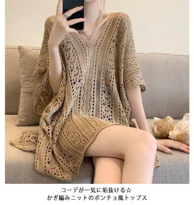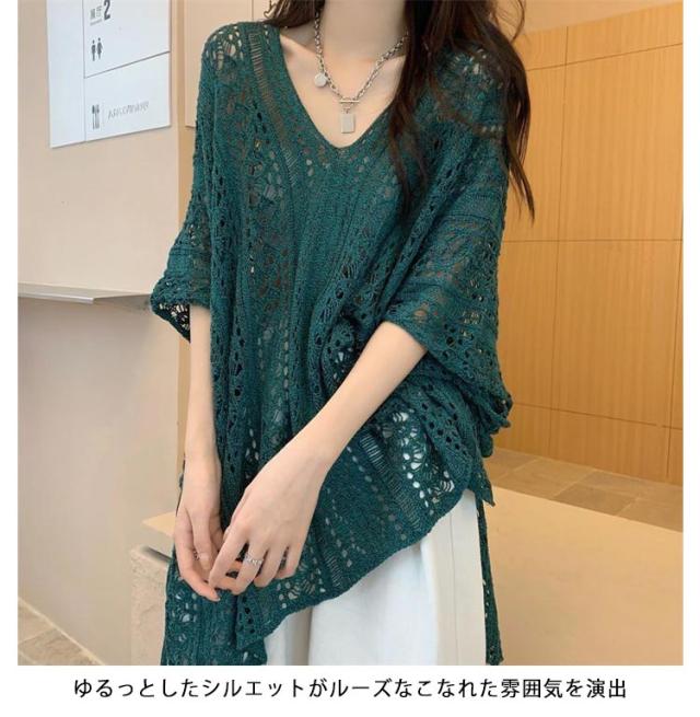 Vネック 半袖 プルオーバー レディース 五分袖 ニット 透かし編み メッシュ ドルマンスリーブ 秋服 透け感 半袖 サマーニット 透かし編み おしゃれ ゆったり 透ける ふんわり 体型カバー 細見え 着?せ 日焼け防止 冷房対策 無地