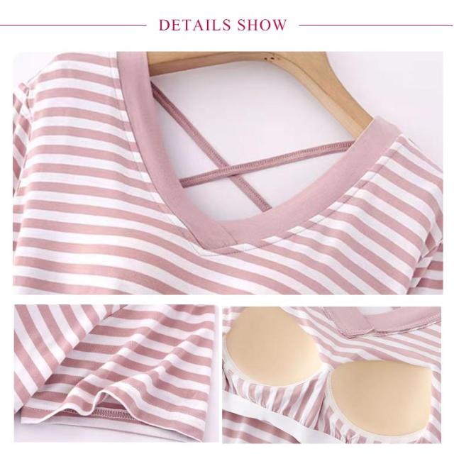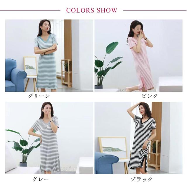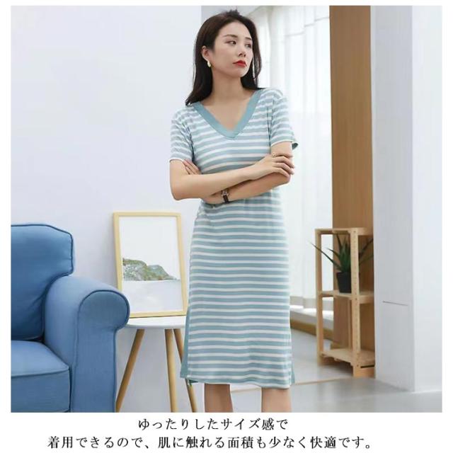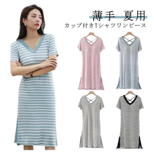 ルームウェア パジャマ ワンピース バッククロス 夏 ナイトウェア 薄手 カップ付き ロングワンピース 半袖 ボーダー柄 おしゃれ レディース 部屋着 バックオープン 涼しい ゆったり 夏用 寝間着 パッド付き カップ付き クロス