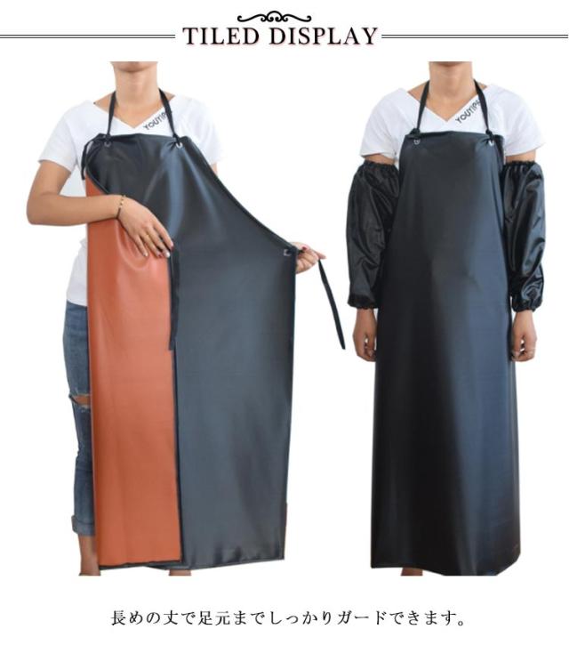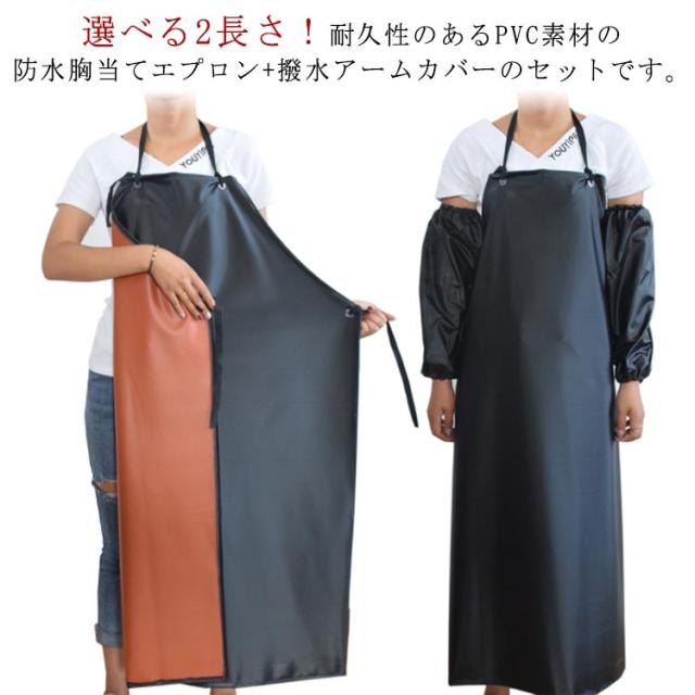 | 選べる2長さ!耐久性のあるPVC素材の防水胸当てエプロン+撥水アームカバーのセットです。 長めの丈で足元までしっかりガードできます。 首掛け紐と腰紐で縛るタイプになりますのでご自身のサイズに合わせて調整できます。 首の紐の長さの調節が自由にできます。 キッチン・ガーデニングなどのご家庭での使用だけでなく、ホールスタッフ、洗濯を重ねても縮みにくく、ヨレにくい丈夫な生地。 学校給食、食品工場、厨房作業など水回りのお仕事に適した仕様のエプロンでございます。 | |