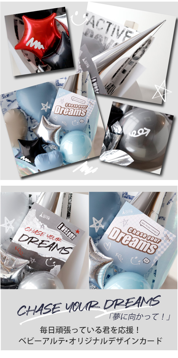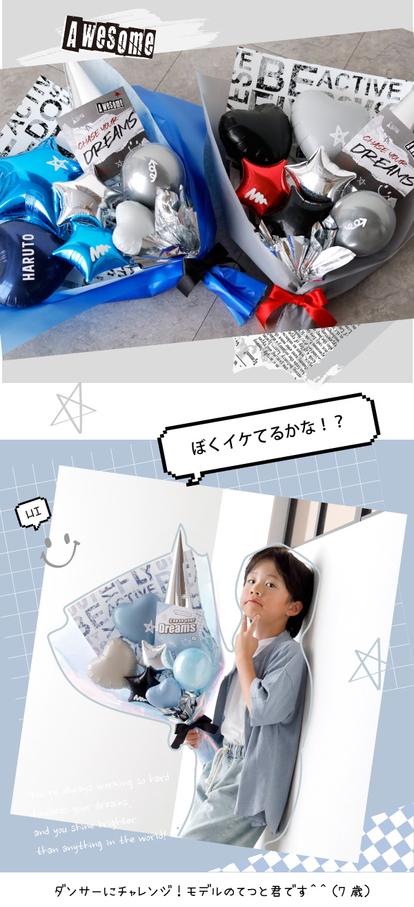 大きいけど軽くて風船の持ちも良いので、お子様〜大人までカンタンに持ち運べます。なかなかカッコいい贈り物がみつからない・・・という方へおススメの花束バルーン。