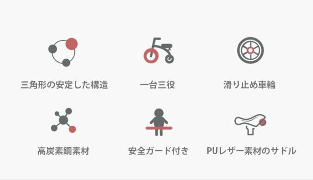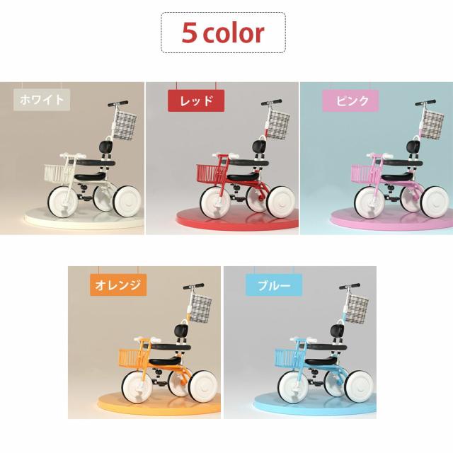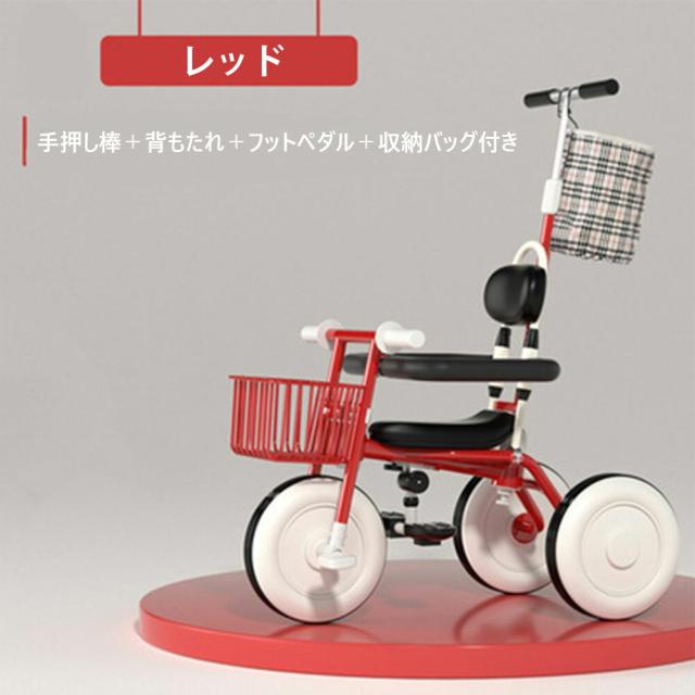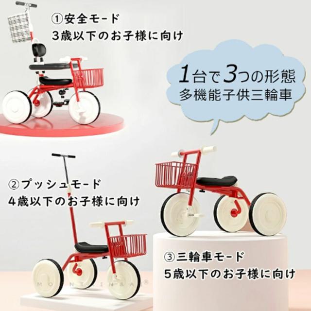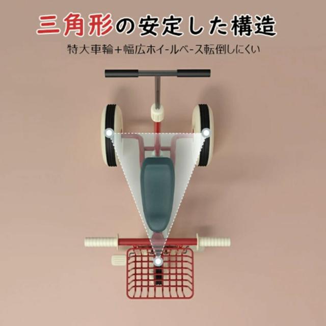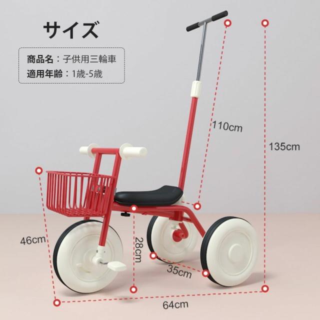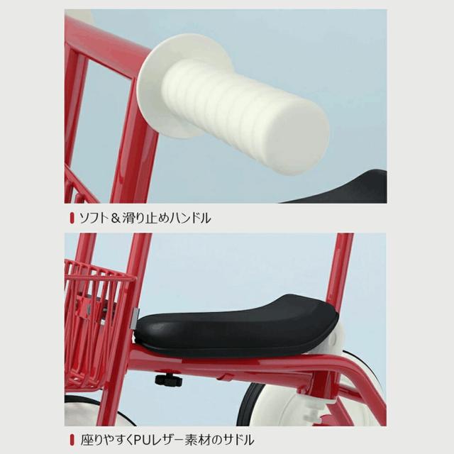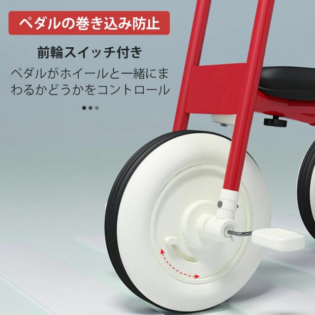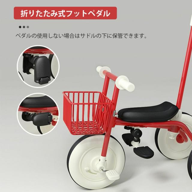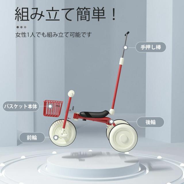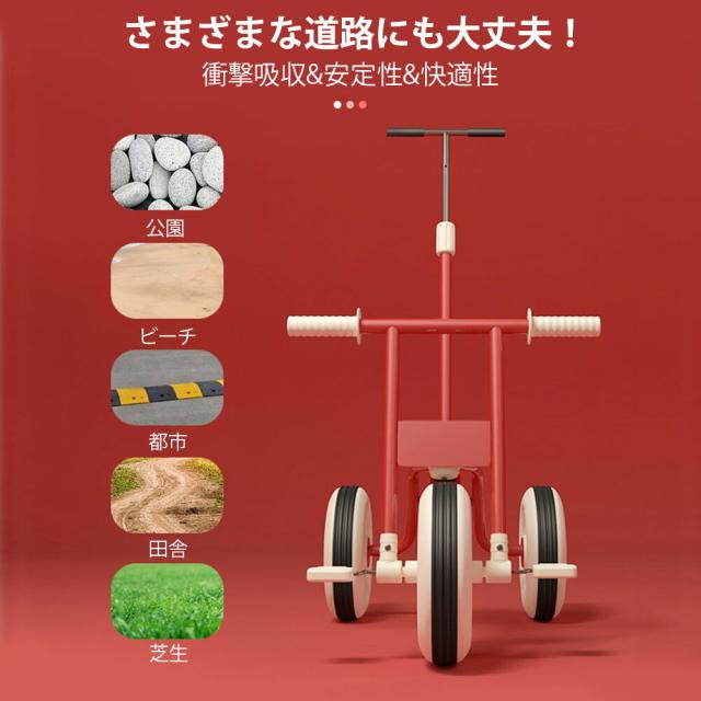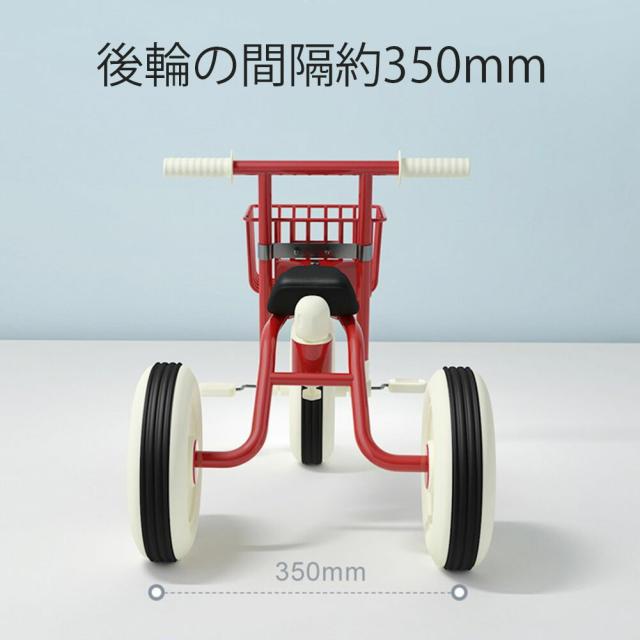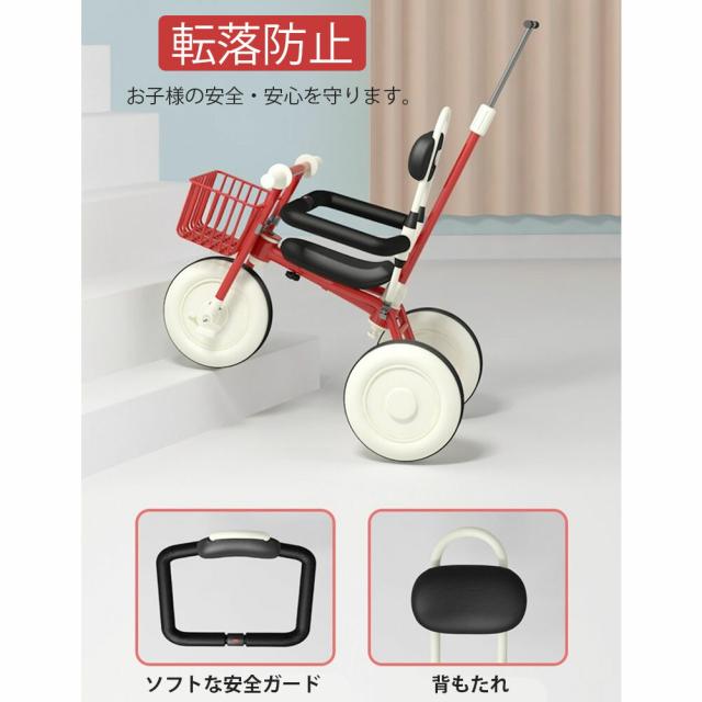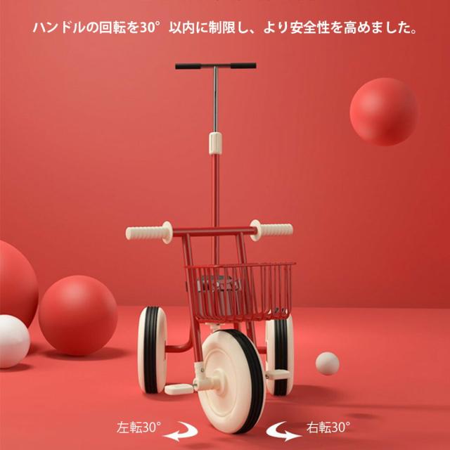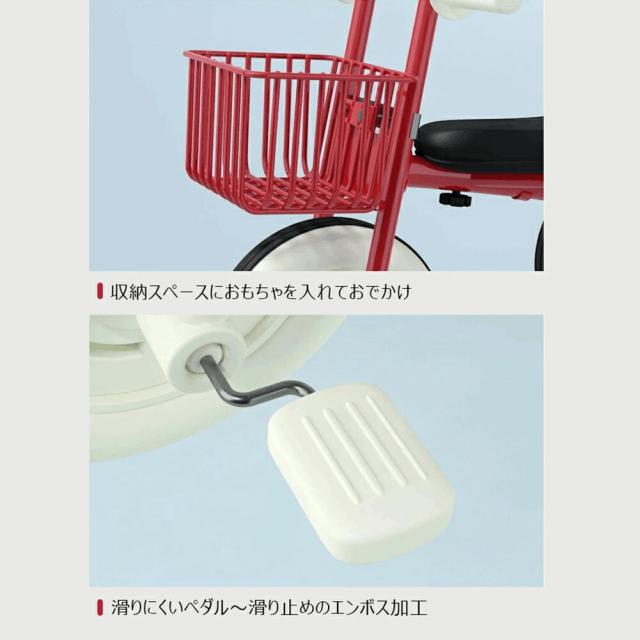 三輪車の後方に補助押し棒がついているので、初めて三輪車に乗るお子さんにおすすめです。まだ漕ぐという動作ができないお子さんでも、大人の方が押してあげることで進むことができ、三輪車に慣れる練習に最適です。誕生日や子供の日、出産お祝いなどのプレゼントとしては非常におすすめです。