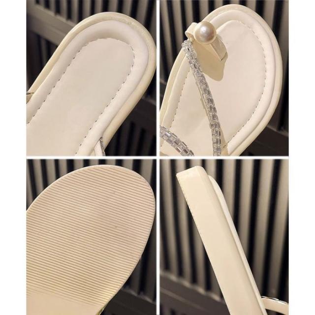 きらきら輝くビジューで飾られた細いストラップが、ヌーディーですっきりとした足元を演出する親指トングサンダル