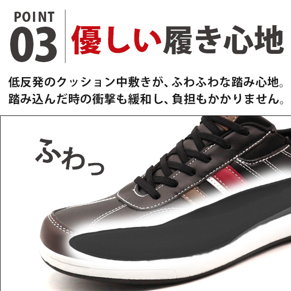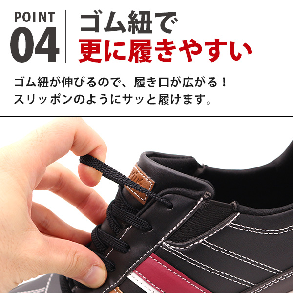 かかと部分が硬いので、手を使わなくても立ったままでスポッと履けます。靴底が柔らかく曲がりやすい靴なので、足の動きに自然とフィットします。低反発のクッション中敷きが、ふわふわな踏み心地。踏み込んだ時の衝撃も緩和し、負担もかかりません。ゴム紐が伸びるので、履き口が広がる。スリッポンのようにサッと履けます。