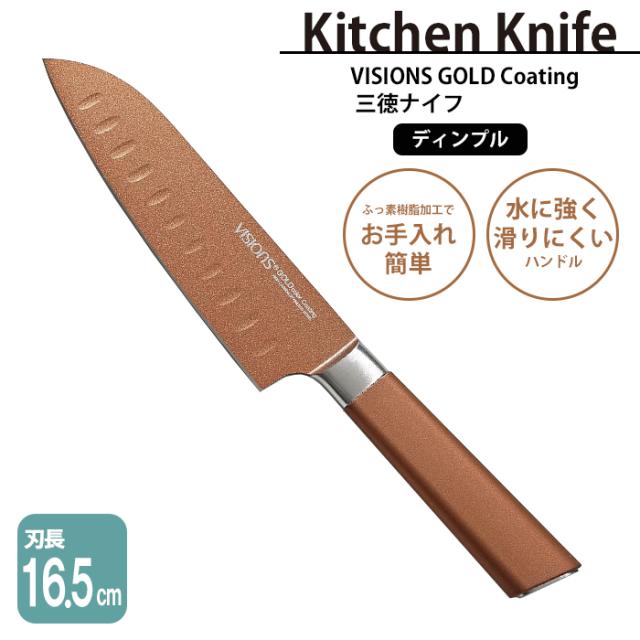 キーワード: 三徳包丁 三徳ナイフ 包丁 ナイフ ディンプル包丁 切り離れ はがれやすい 肉 魚 野菜 お手入れ簡単 ハイカーボンステンレス鋼 硬質セラミック配合 耐久性 滑りにくい ソフトグリップ クッキングナイフ 調理器具 料理 調理 クッキング VISIONS GOLD Coating 三徳ナイフ 165 ディンプル