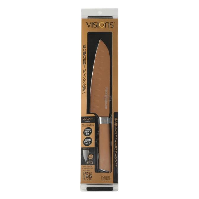 | VISIONS GOLD Coating ● シェフナイフ180 ● 三徳ナイフ165 ● 三徳ナイフ165 ディンプル ● ペディナイフ125 ※このページは[三徳ナイフ165 ディンプル]を販売しております。 |