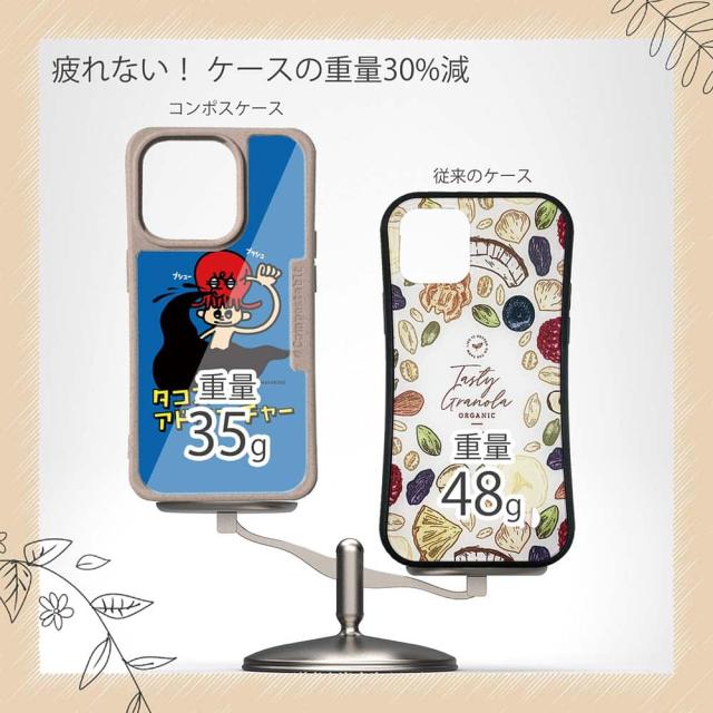 | 注意事項 | コンポスケースは、フレーム部分に「生分解性プラスチック」という環境に優しい素材を使用しております。そのため擦ったり、ぶつけたりする衝撃を与えると脆い部分もあります。耐衝撃ケースではないことをご了承ください。 Qi充電やMagSafe充電にも対応していますが、装着していない時に比べると充電速度は落ちます。 |