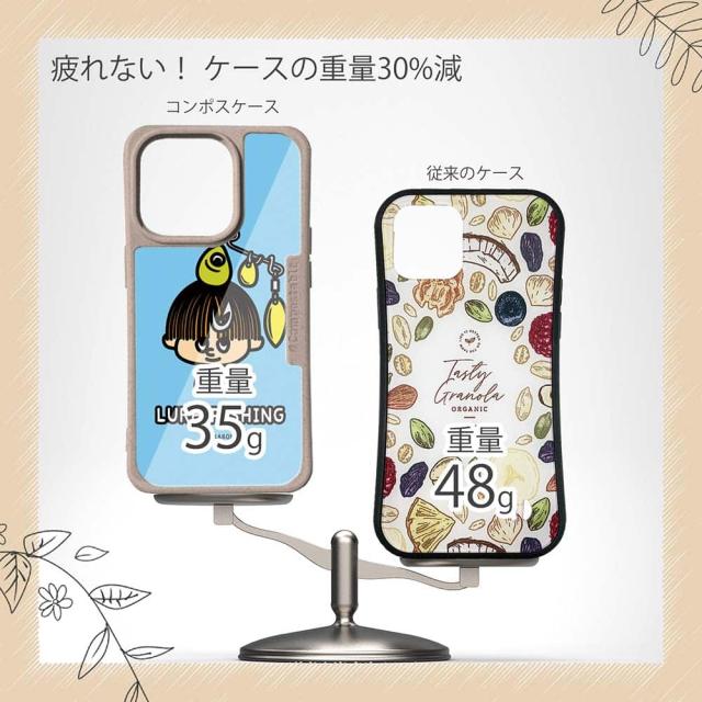 | ケースについて | 背面の内側に入れ込むデザインシートで、シーンに合わせて着せ替え可能。また、グリップしやすいクッション構造で、本体重量は約35gと軽減化を実現。さらに衝撃に強いSライン形状、究極に押しやすいボタン設計(切り込みが入ることで押し込む力を軽減)、背面のカメラ・レンズを保護する高さ設計となっております。生分解性プラスチック素材ながらも着脱もしやすく、割れない・指紋防止加工を施しています。 |
