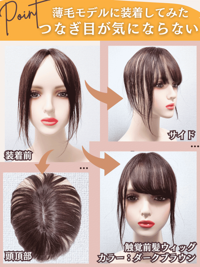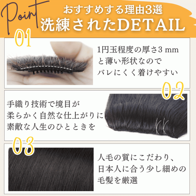 | 特徴3 | 人毛の質にこだわり、日本人に合う少し細めの毛髪を厳選 |