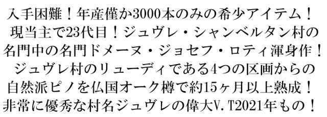 入手困難!年産僅か3000本のみの希少アイテム! 現当主で23代目!ジュヴレ・シャンベルタン村の 名門中の名門ドメーヌ・ジョセフ・ロティ渾身作! ジュヴレ村のリューディである4つの区画からの 自然派ピノを仏国オーク樽で約15ヶ月以上熟成! 非常に優秀な村名ジュヴレの偉大V.T2021年もの!