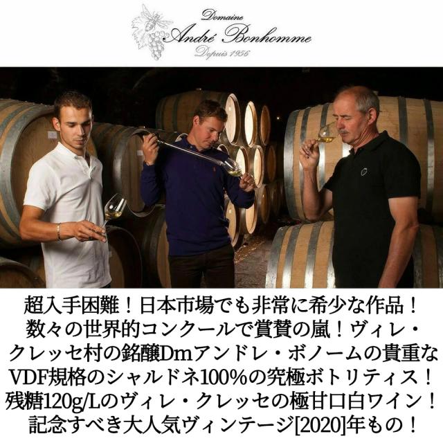 超入手困難!日本市場でも非常に希少な作品! 数々の世界的コンクールで賞賛の嵐!ヴィレ・ クレッセ村の銘醸Dmアンドレ・ボノームの貴重な VDF規格のシャルドネ100%の究極ボトリティス! 残糖120g/Lのヴィレ・クレッセの極甘口白ワイン! 記念すべき大人気ヴィンテージ[2020]年もの!
