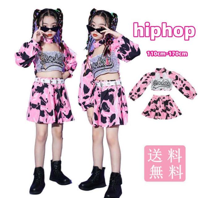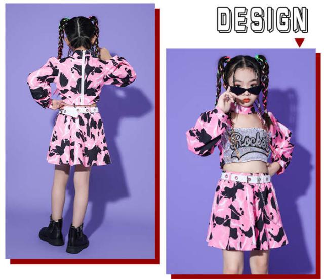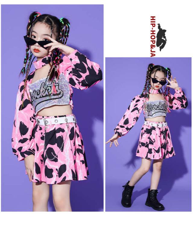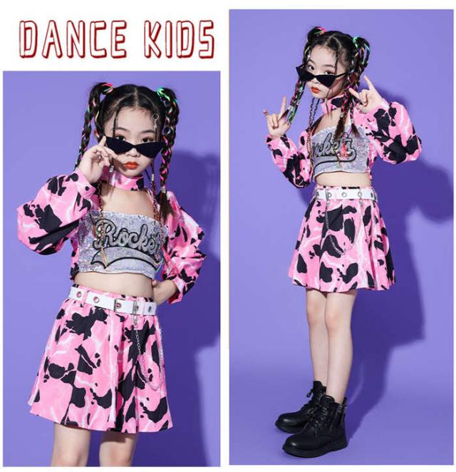 ダンスウェア 女の子 キッズジャズダンス衣装 ストレートダンス衣装 ダンス服 チアガール トップス 長袖 へそ出しスカート スパンコール