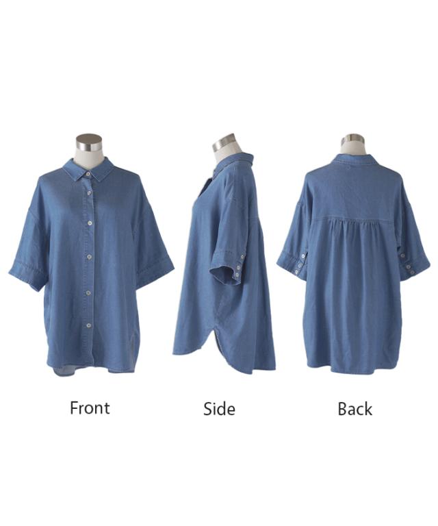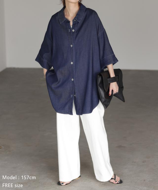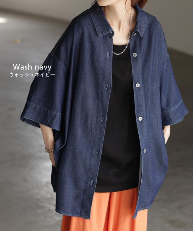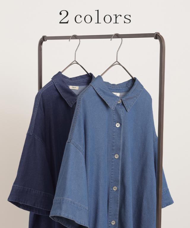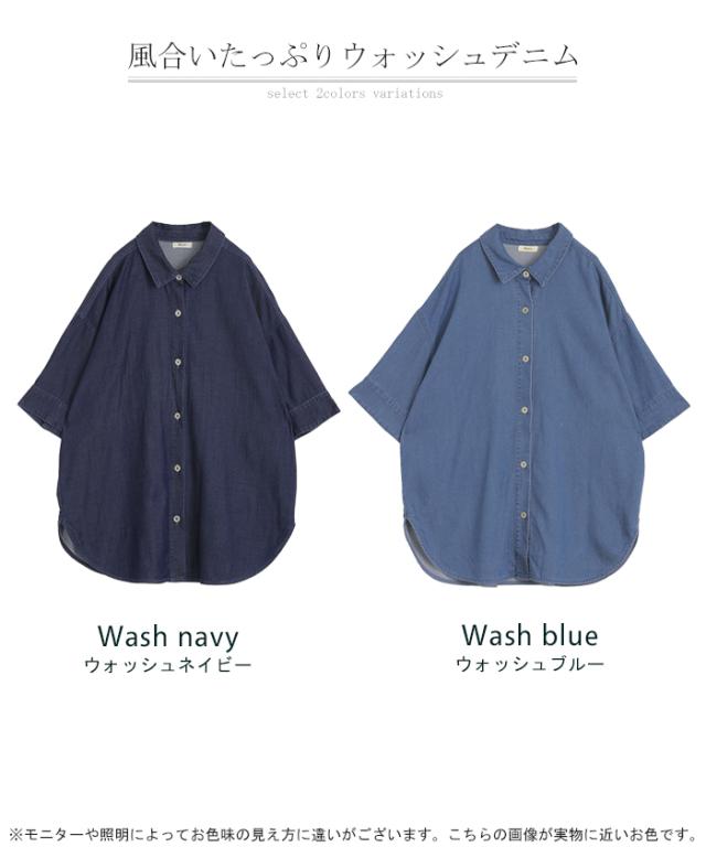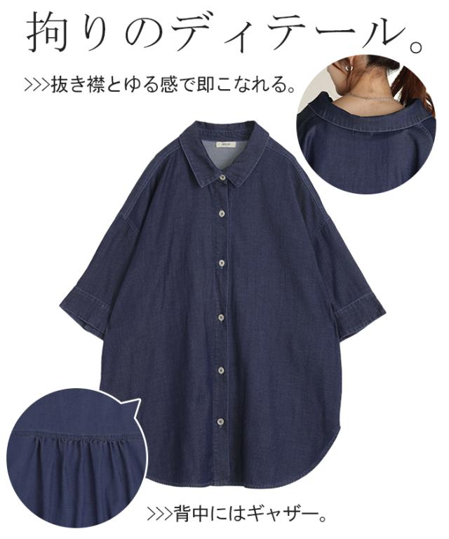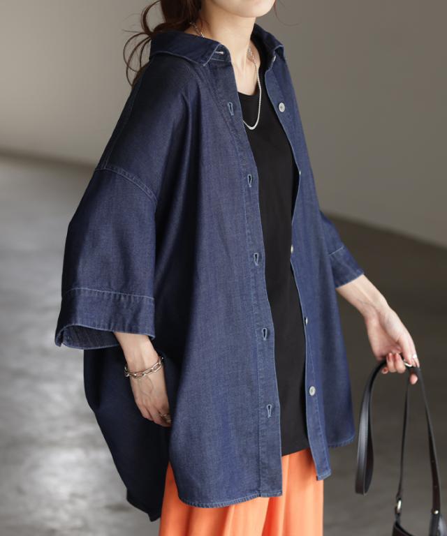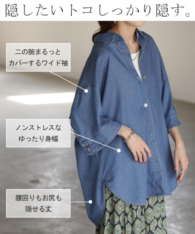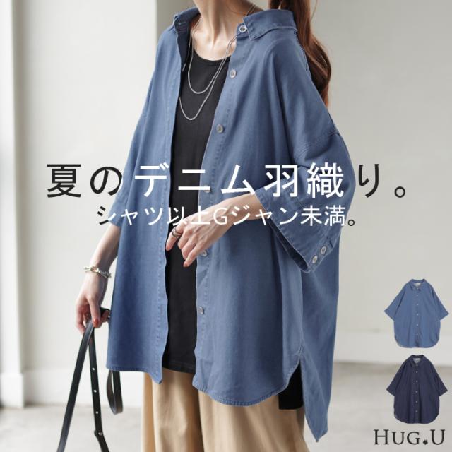 シャツ デニムシャツ 半袖 レディース 4月下旬入荷 ロング ロングシャツ チュニック オーバーサイズ アウター デニムジャケット デニム トップス ジャケット ドルマン 体型カバー お尻が隠れる 二の腕カバー 羽織 大きいサイズ ブルー ネイビー 春 夏 HUG.U 秋新作