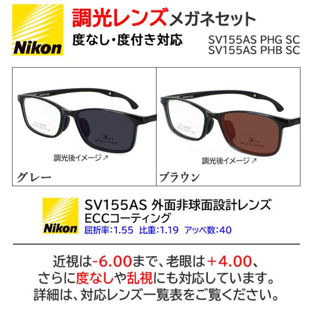| 商品詳細 スクエア 度付き 度なし 調光メガネ 薄型 非球面レンズ セット 近視 遠視 老眼 乱視対応 、度なしの調光サングラスにも対応。 こちらはメンズ レディース 男女兼用モデルです。 フレームはTR90素材で軽量で柔軟性に優れた樹脂素材。 顔にやさしくフィットします。 ●ラバー製鼻パッド ラバー製で鼻盛りが高く設計されていて、 スポーツやアクティビティーな時でも ズレにくい仕様となっています。 ●可動式の調整可能なモダン 先セル(モダン・耳掛け)部分は可動式で 調整可能な仕様となって、スポーツなどにも 最適です。 近眼 度数は-6.00まで、老眼度数は+4.00まで対応。 乱視にも対応しています。 度なし の調光レンズ0.00にも対応しています。 詳細は、対応レンズ 一覧表をご覧ください。 調光レンズはグレー調光とブラウン調光の2カラーをご用意。 調光レンズ 「無色透明レンズのメガネ」と「サングラス」の機能が1本のメガネに! レンズに練りこまれた「調光素材」が紫外線に反応して、レンズの色が変わります。 屋内など紫外線が当たらない時はほぼクリアのレンズ。 屋外では、紫外線がレンズに当たるとレンズの色が変化し、サングラスに。 ※ご使用状況によって、調光しない場合もございます。調光レンズの特性をご確認のうえ、お買い求めお願いします | |