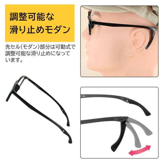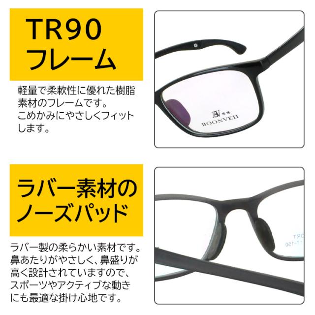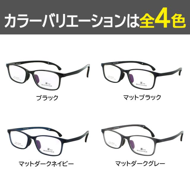 | <フレームカラー> ブラック マットブラック マットダークネイビー マットダークグレー | <素材> フレーム材質: TR90素材 テンプル材質:TR90素材 |