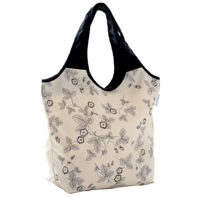 刺繍のように描かれたワイルドストロベリーをプリントで施しました。開口部はファスナー付きで中身が見えない作りです。折りたたんでコンパクトにお持ちいただけます。
