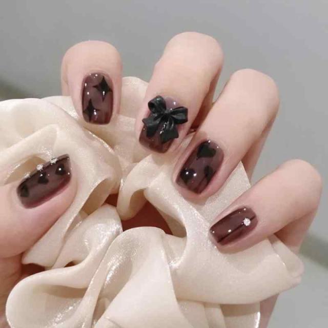 【量産型や地雷系3D付け爪】かっこいいで個性的な黒い系ネイルチップが登場定番ネイルアート女性魅力感抜群のネイルチップ ロング 黒、蝶結びや パールがキラキラと輝きます。今話題の大人気の量産型や地雷系にぴったり輝きます。今話題の大人気の量産型や地雷系にぴったり