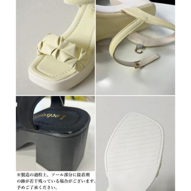 アッパーにはPUレザー素材を使用しており、ギャザーデザインがポイントのチャンキーヒールサンダル
