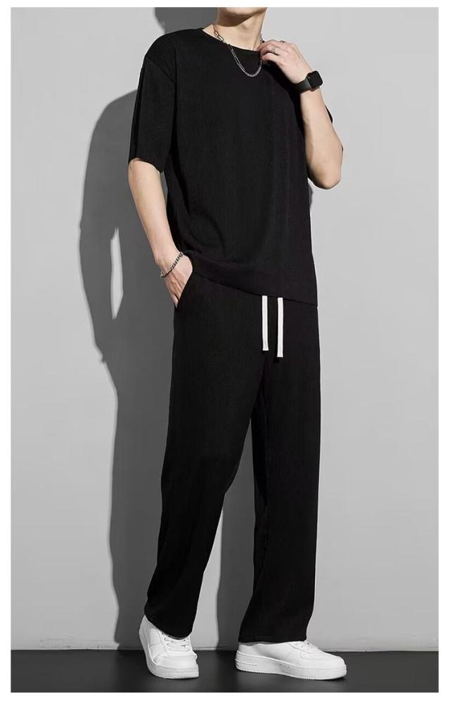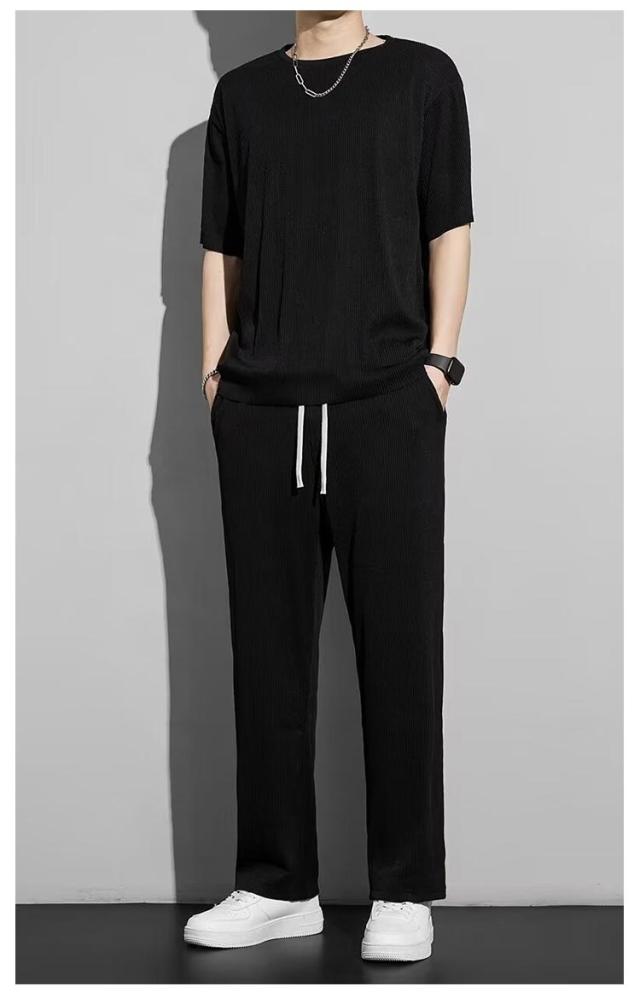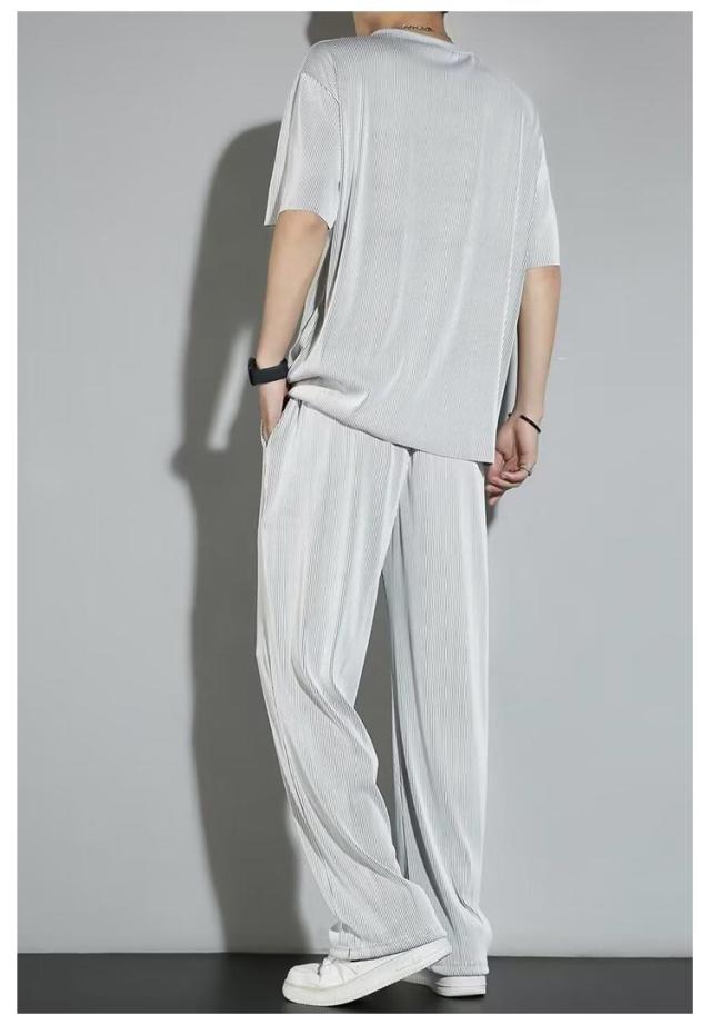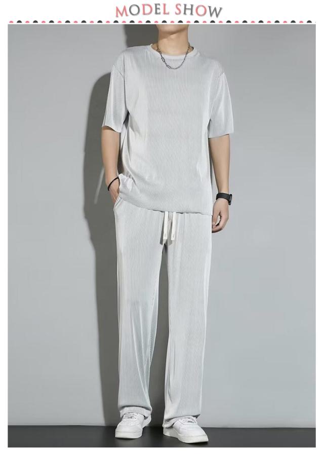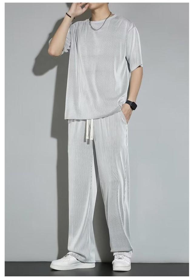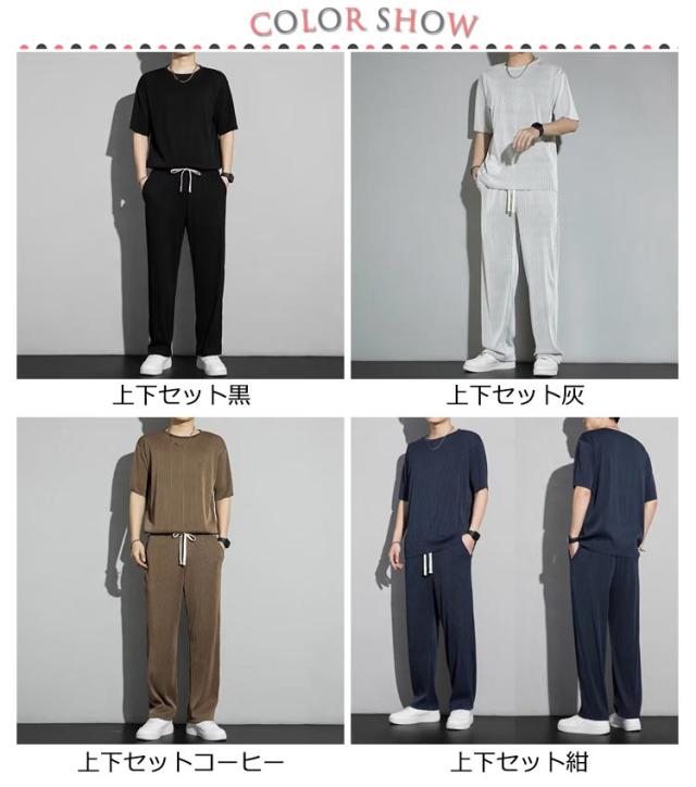 2点セット アイスシルク ロングパンツ ルームウェア ロング上下セット アイスシルク Tシャツ メンズ トップス セットアップ スウェット ジャージ カジュアル 半袖 ゆったり 大きサイズ 夏 ストレッチ 通気性 涼しい カジュアル 柔らかい 接触冷感