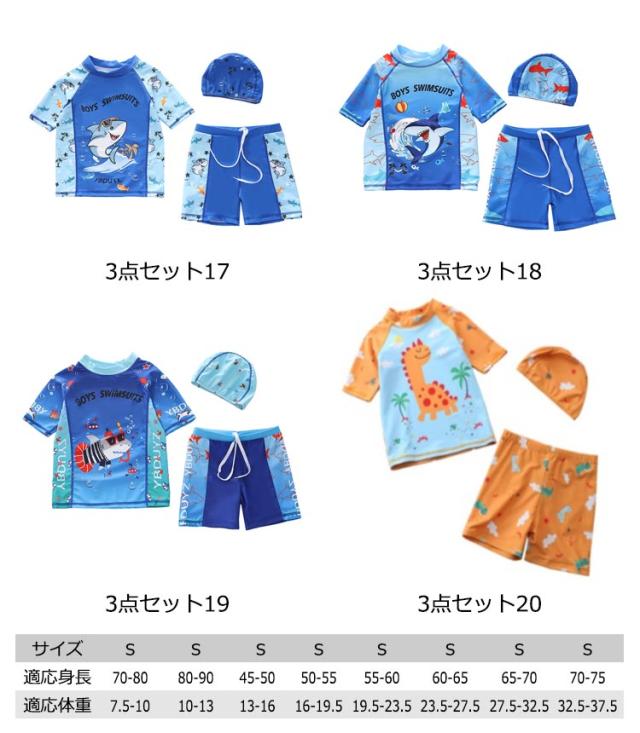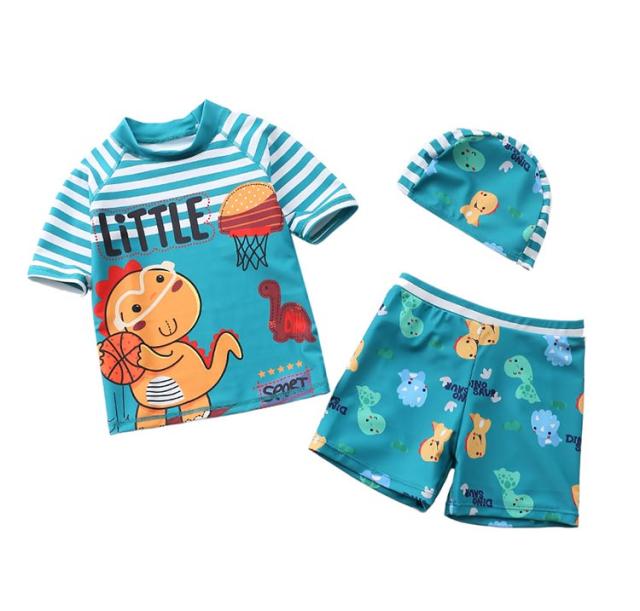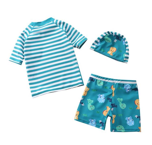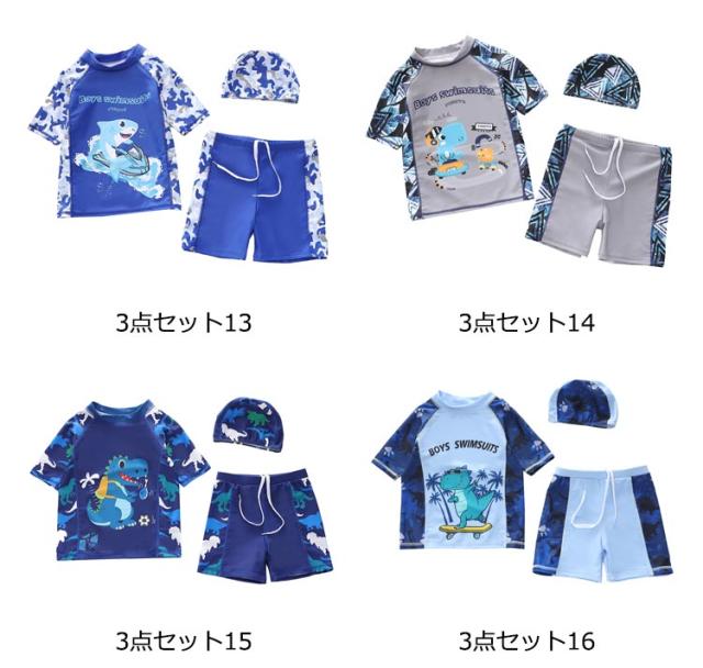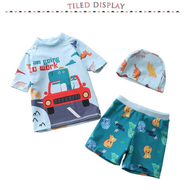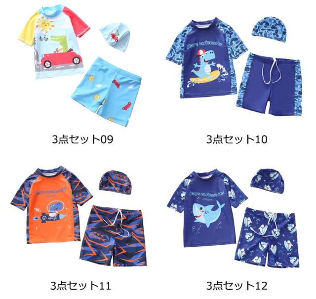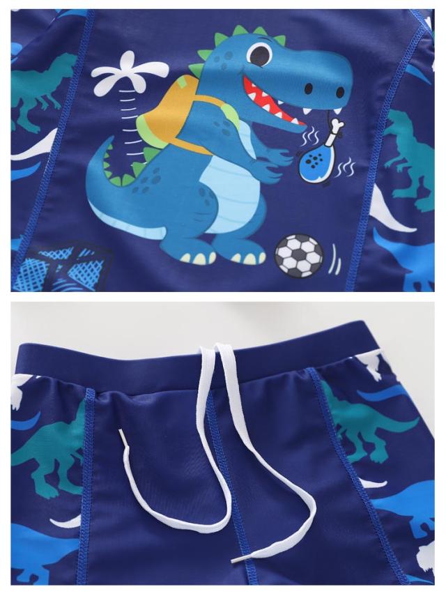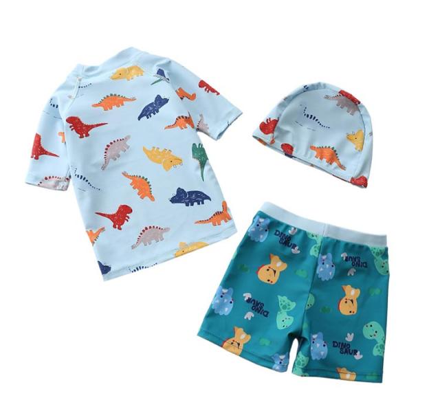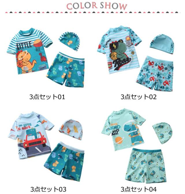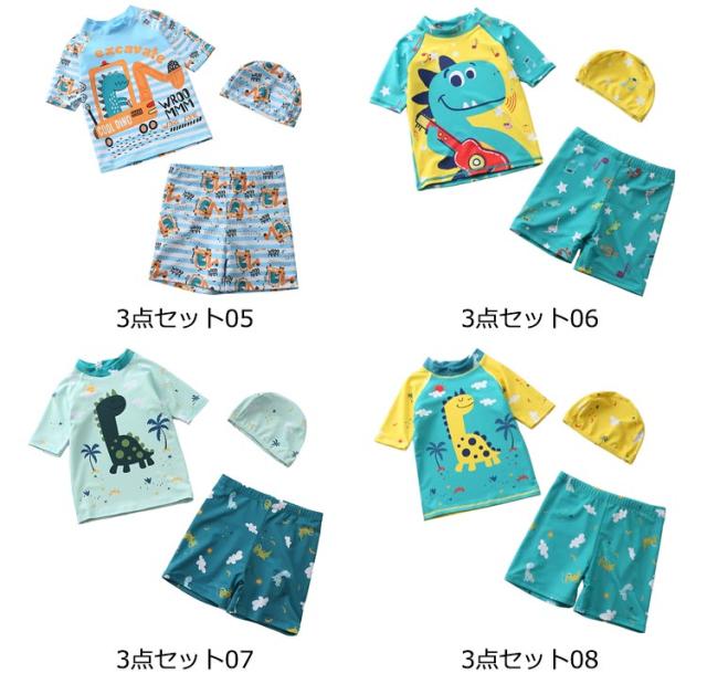 紫外線防止 恐竜柄 男の子 キッズ 高弾力 3点セット ベビー おしゃれ かわいい 水着 半袖 スイムウェア ラッシュガード キャップ付き 色落ちしない 夏 海水浴 キャップ付き キュート 水泳 海