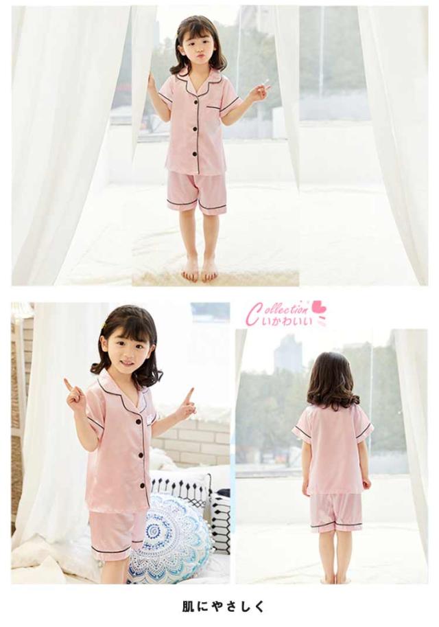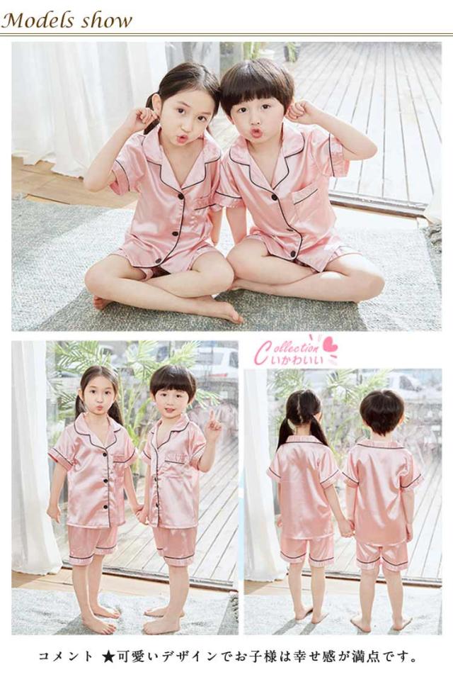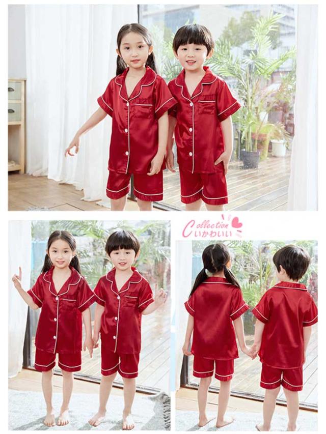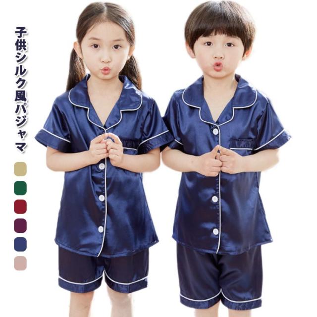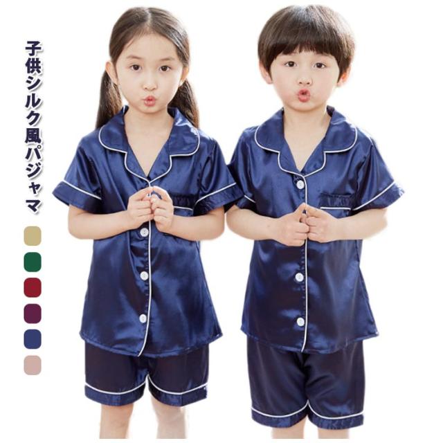 部屋着 男女兼用 半袖 100 送料無料 前開き ルームウェア 寝巻き こどもパジャマ シルク風パジャマ 前ボタン キッズパジャマ 6色 ブルー パープル レッド ピンク グリーン 送料無料 ゴールド 110 120 130 140