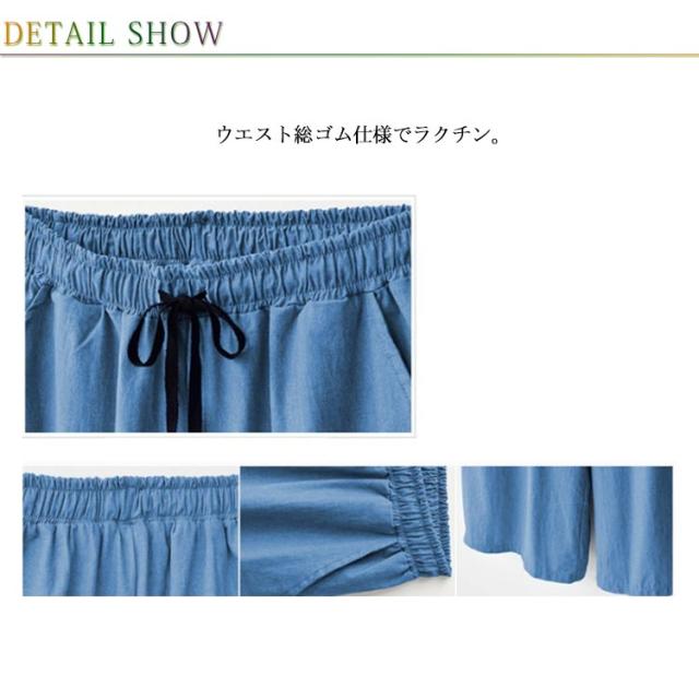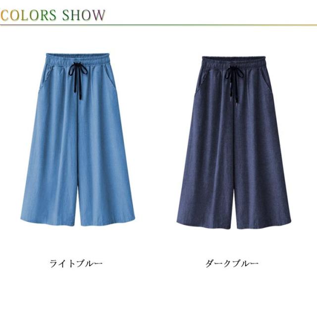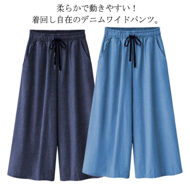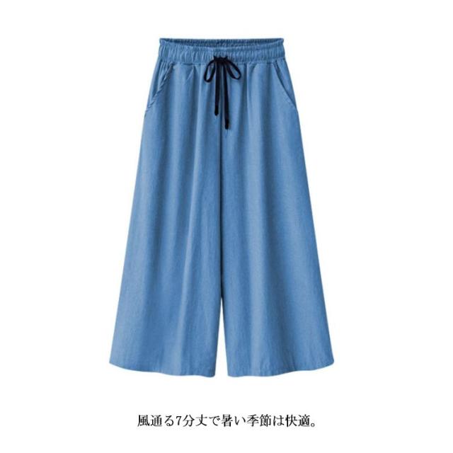 ワイドパンツ ウェストゴム ガウチョパンツ レディース 7分丈 ポケット付き 涼しい ハイウェスト 夏 イージーパンツ 薄手 ゆるパンツ カジュアル デニムパンツ デニムパンツ