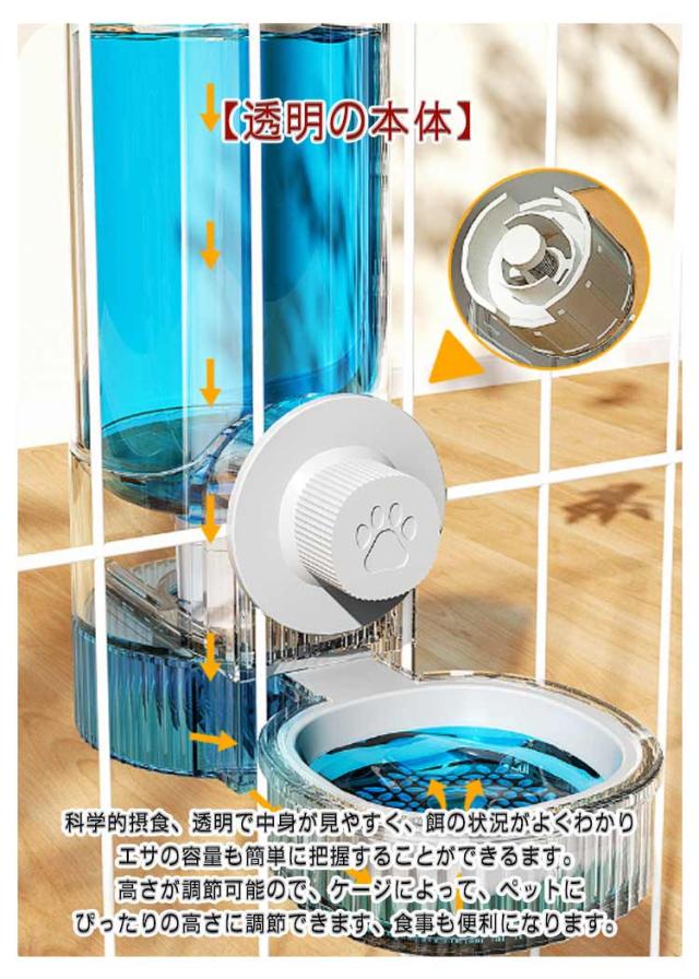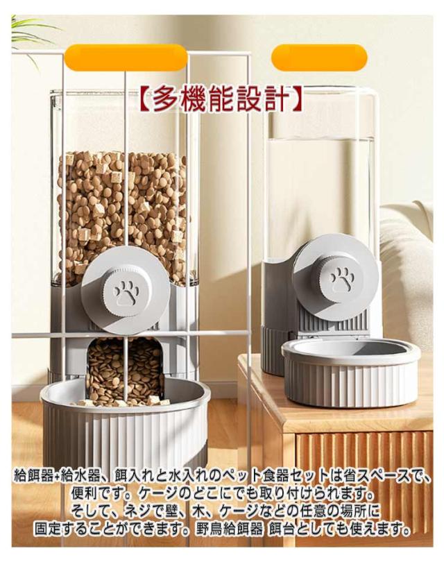 | ペット自動給餌器&自動給水器 5日給餌・7日給水 【お留守番対策】大容量のフードストレージで、頻繁にフードを補充する必要がなく、帰宅が遅い時や、急な出張、短時間の旅行など飼い主さん不在でも、オートペットフィーダーはネコちゃん、ワンちゃんに自動給餌給水で安心安全です。 【多機能設計】給餌器+給水器、餌入れと水入れのペット食器セットは省スペースで、便利です。ケージのどこにでも取り付けられます。そして、ネジで壁、木、ケージなどの任意の場所に固定することができます。野鳥給餌器 餌台としても使えます。 【安定感抜群】ケージに固定できるから、ずれたり、ひっくり返る心配なく、長い留守でもペットの食事の心配がなしです。給水器はヒゲが濡れにくい設計も嬉しいポイントです。 【高品質材料】高品質でお手入れしやすく丈夫で、洗いやすいです。餌やりは安心である。食品グレードの健康的な材料です。パーツごとに分解して、洗えるからいつも清潔にお使いいただけます。 【簡単に組み立て】初心者でも取り付けやすいシンプルなデザイン設計です。変位を避けるための固定ノブ、脱落を防ぎ、分解しやすい。ケージ内部に引っ掛けるやケージ外部に合わせて簡単に引っ掛けられます。 【透明の本体】科学的摂食、透明で中身が見やすく、餌の状況がよくわかりエサの容量も簡単に把握することができるます。高さが調節可能ので、ケージによって、ペットにぴったりの高さに調節できます、食事も便利になります。 | |