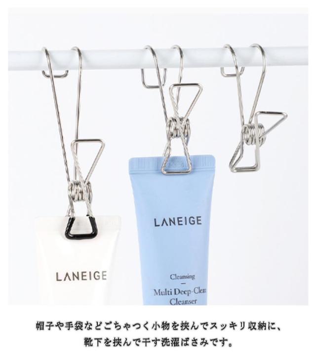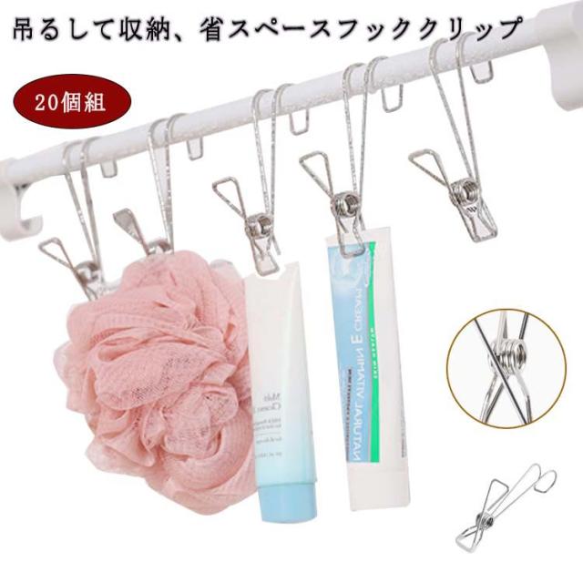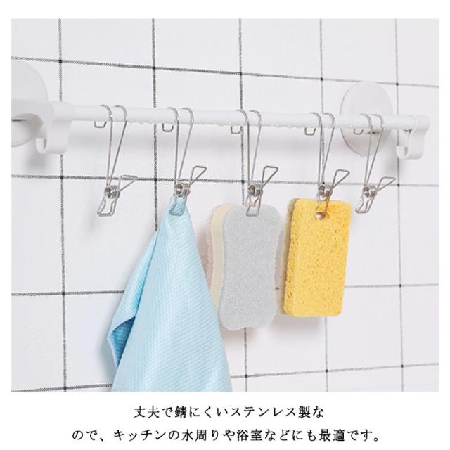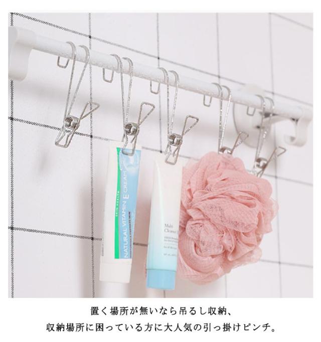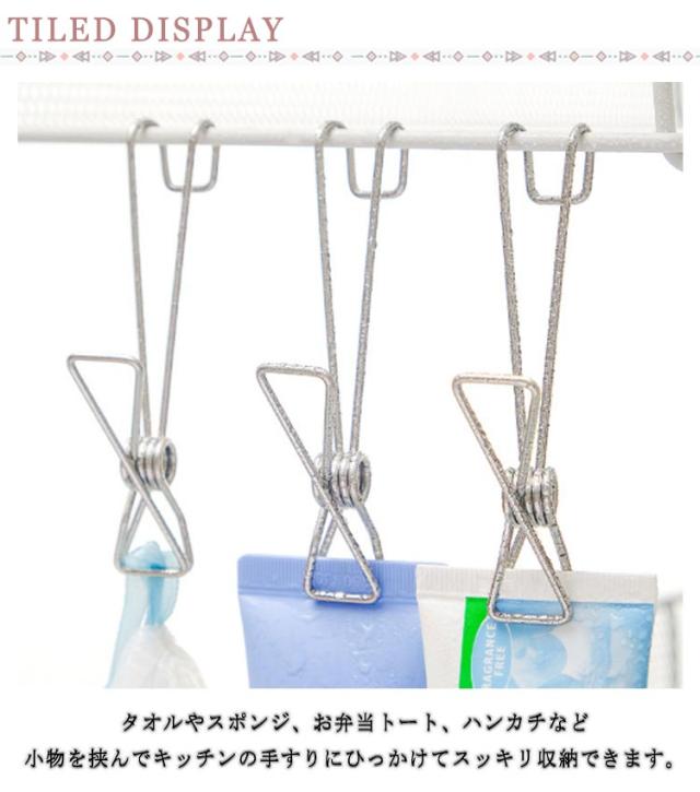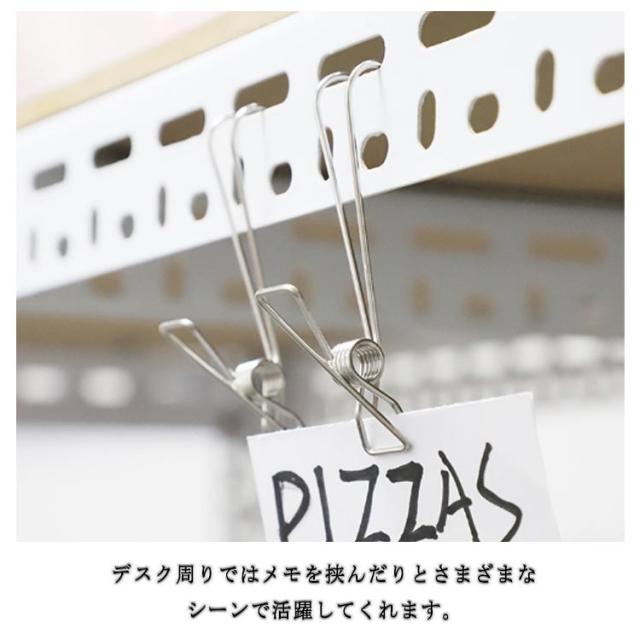 | 吊るして収納、省スペースフッククリップ タオルやスポンジ、お弁当トート、ハンカチなど小物を挟んでキッチンの手すりにひっかけてスッキリ収納できます。 置く場所が無いなら吊るし収納、収納場所に困っている方に大人気の引っ掛けピンチ。 丈夫で錆にくいステンレス製なので、キッチンの水周りや浴室などにも最適です。 帽子や手袋などごちゃつく小物を挟んでスッキリ収納に、靴下を挟んで干す洗濯ばさみです。 デスク周りではメモを挟んだりとさまざまなシーンで活躍してくれます。 | |