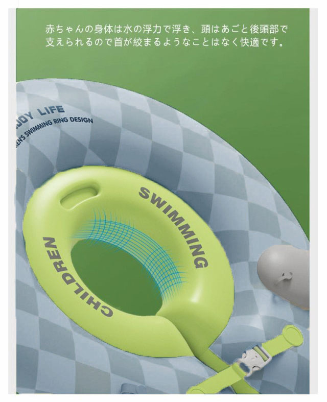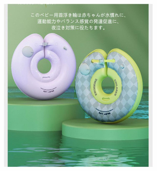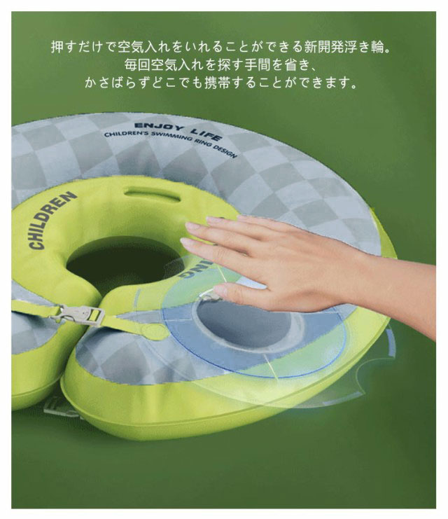 | 手で押すだけで、簡単に膨らせる赤ちゃん用の浮き輪。 押すだけで空気入れをいれることができる新開発浮き輪。毎回空気入れを探す手間を省き、かさばらずどこでも携帯することができます。 このベビーフロートはお風呂でプールで使用することで、水中に浮いた状態で手足を自由に動かす感覚に慣れることができます。 赤ちゃんの身体は水の浮力で浮き、頭はあごと後頭部で支えられるので首が絞まるようなことはなく快適です。 赤ちゃんが舐めても安全な素材を使用し、上下2本ベルトで赤ちゃんをしっかり固定し、安定感抜群! このベビー用首浮き輪は赤ちゃんが水慣れに、運動能力やバランス感覚の発達促進に、夜泣き対策に役たちます。 | |